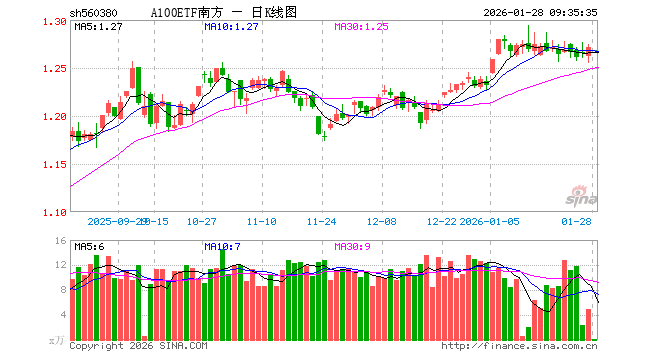 1月28日,A100ETF南方(560380)开盘跌0.24%,报1.268元。A100ETF南方(560380)重仓股方面,宁德时代开盘跌0.45%,贵州茅台涨0.00%,中国平安涨0.86%,中际旭创涨2.66%,紫金矿业涨1.95%,招商银行涨0.05%,美的集团跌0.01%,长江电力涨0.00%,东方财富涨0.00%,立讯精密跌0.04%。