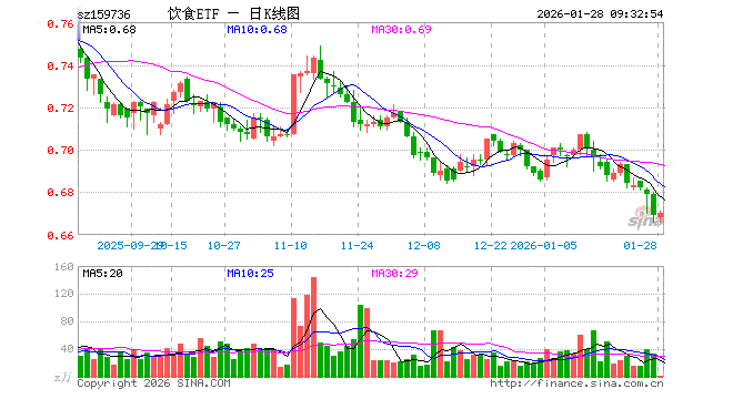 1月28日,食品饮料ETF天弘(159736)开盘跌0.15%,报0.668元。食品饮料ETF天弘(159736)重仓股方面,伊利股份开盘涨0.23%,贵州茅台涨0.00%,五粮液涨0.01%,泸州老窖跌0.32%,山西汾酒跌0.22%,海天味业涨0.08%,东鹏饮料跌0.08%,洋河股份跌0.28%,双汇发展涨0.04%,安琪酵母涨0.00%。