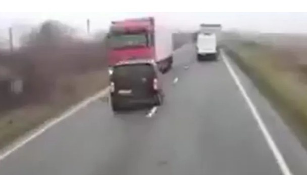 驾驶面包车的司机试图猛打方向盘躲避碰撞,却反而径直驶入了这辆多轴重型卡车的行驶路线。猛烈的撞击将体型小得多的面包车撞飞到马路对面,道路两条车道上散落着大量车辆残骸。急救人员迅速赶往事故现场,事发地点位于罗马尼亚西部卡兰塞贝什镇和卢戈日镇之间的E70号高速公路。