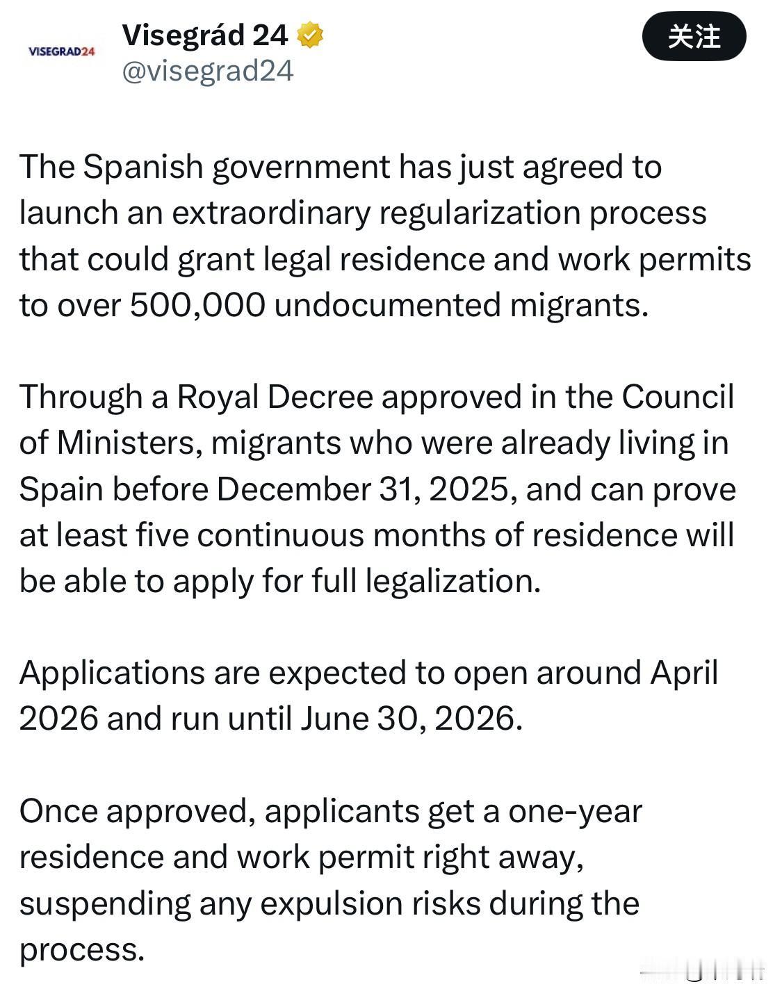 最新消息:西班牙政府刚刚同意启动一项特殊的合法化程序,该程序可能会向超过 50 万名无证移民授予合法居留和工作许可。 根据部长会议批准的皇家法令,在 2025 年 12 月 31 日之前已在西班牙居住,并能证明至少连续居住五个月的移民,将能够申请完全合法化。 预计申请将于 2026 年 4 月左右开放,并持续到 2026 年 6 月 30 日。 一旦获得批准,申请人将立即获得为期一年的居留和工作许可,在此期间不会面临任何驱逐风险。