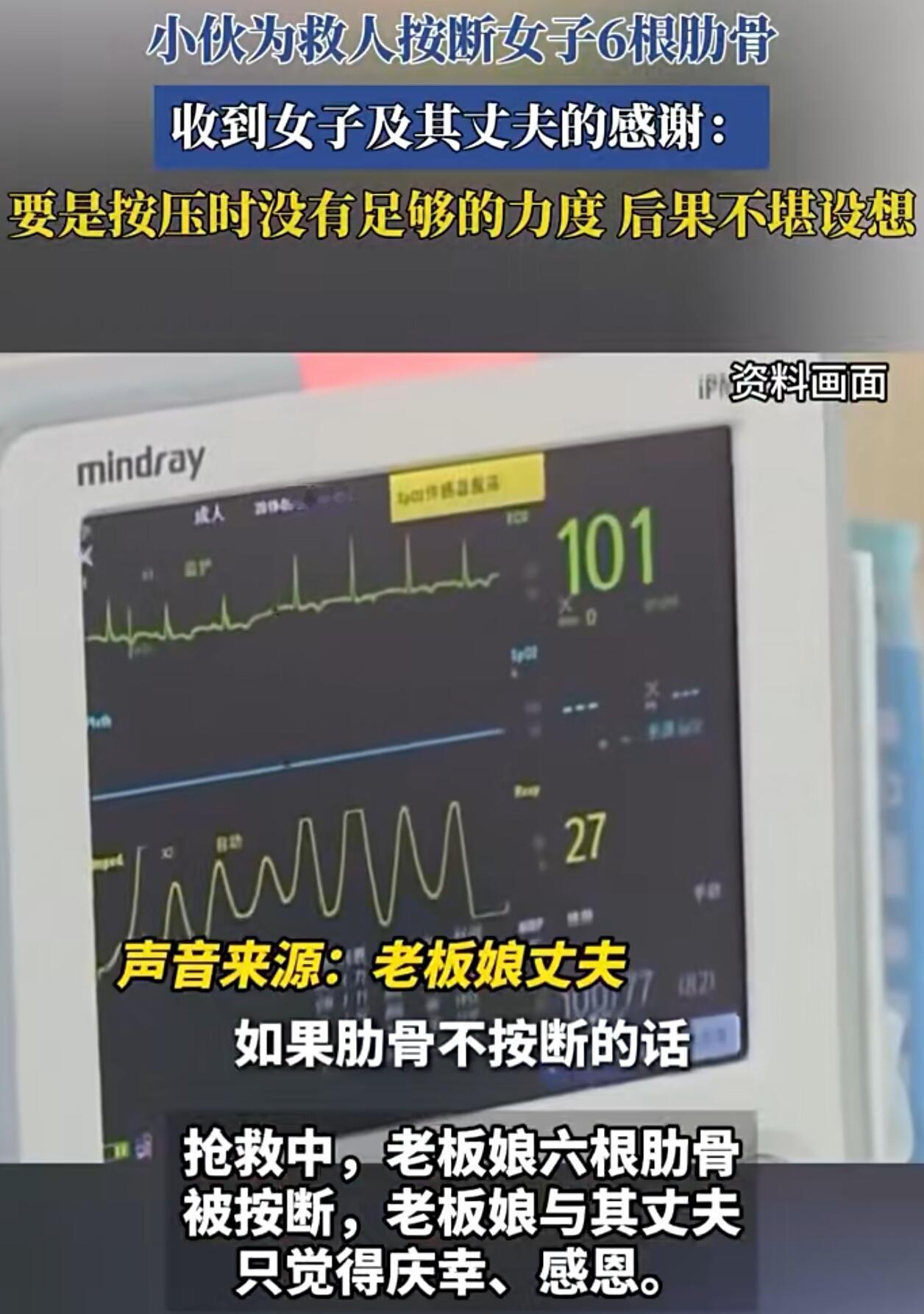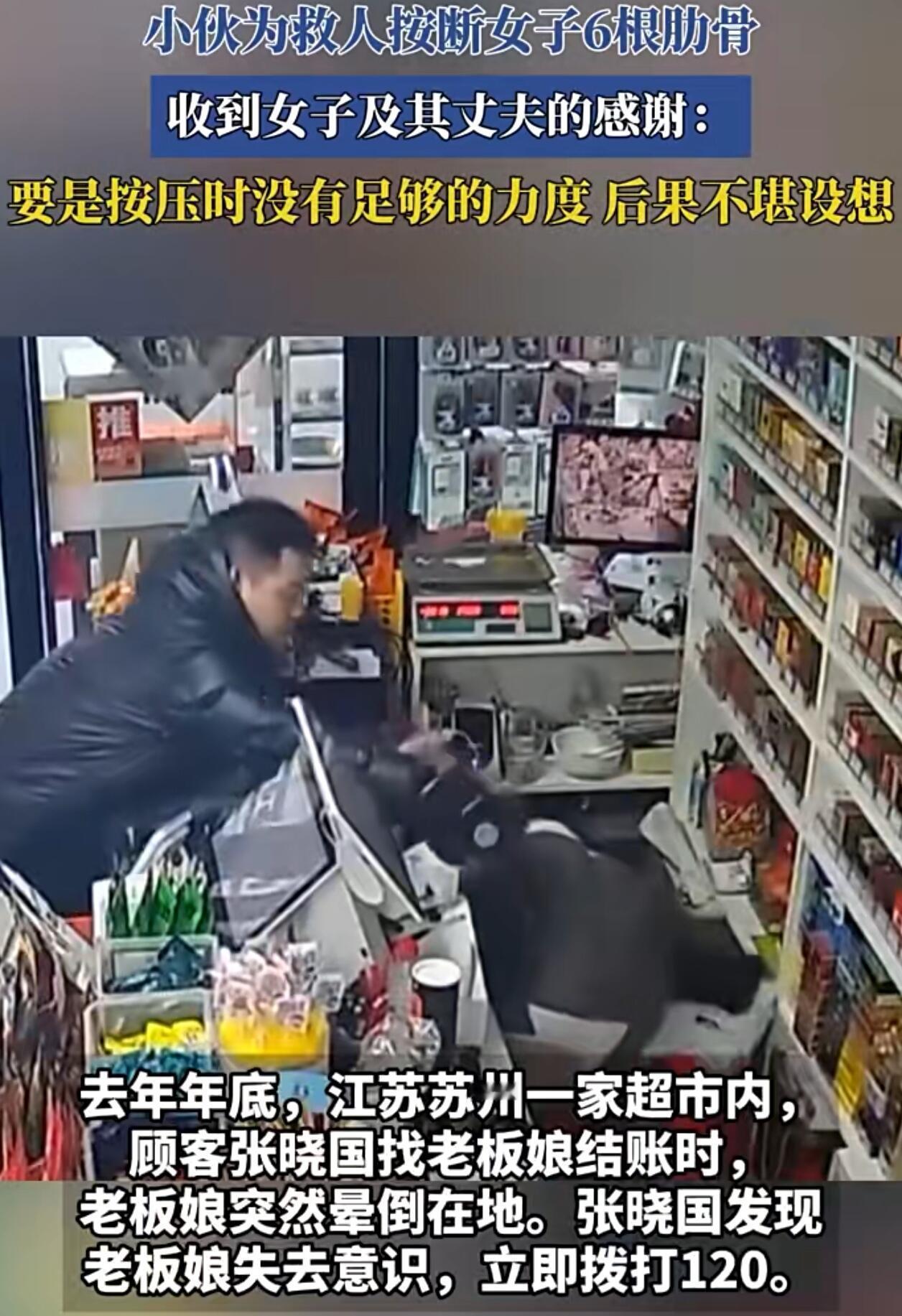 苏州一家超市的老板娘突然晕倒,一个叫张晓国的顾客冲上去就给她做心肺复苏。他照着120电话里的指导,按了足足600多下,还做了人工呼吸。人是救回来了,可老板娘肋骨被按断了6根。 这事网上吵得挺厉害。有人说张晓国是英雄,人命关天的时候能站出来就不容易,肋骨断了总比人没了强。但也有人觉得,按断6根肋骨是不是手法不对?会不会救出后遗症? 说实话,心肺复苏这操作,本身力度就得大,尤其对成年人,断肋骨其实不算罕见。在那种紧急关头,能冷静下来、坚持做完急救,已经非常了不起了。老板娘丈夫自己也说,这恩情一辈子还不完,说明家属是理解的。 所以我觉得,张晓国当然该被肯定。这不是专不专业的问题,而是救不救的问题。普通人敢上前,能跟着电话指导做,已经非常不容易。肋骨骨折可以慢慢养,但命没了就什么都没了。要我说,这种见义勇为的精神,就该大力夸。