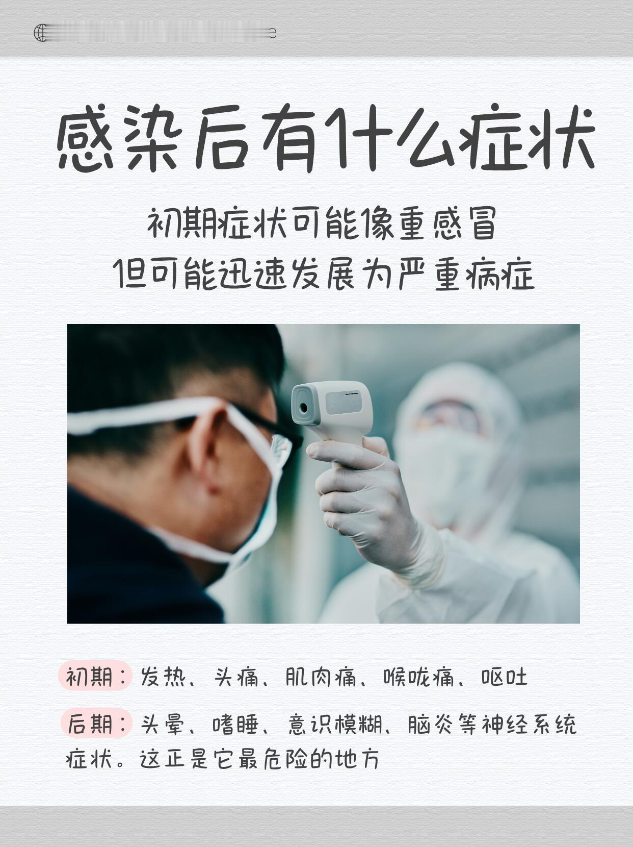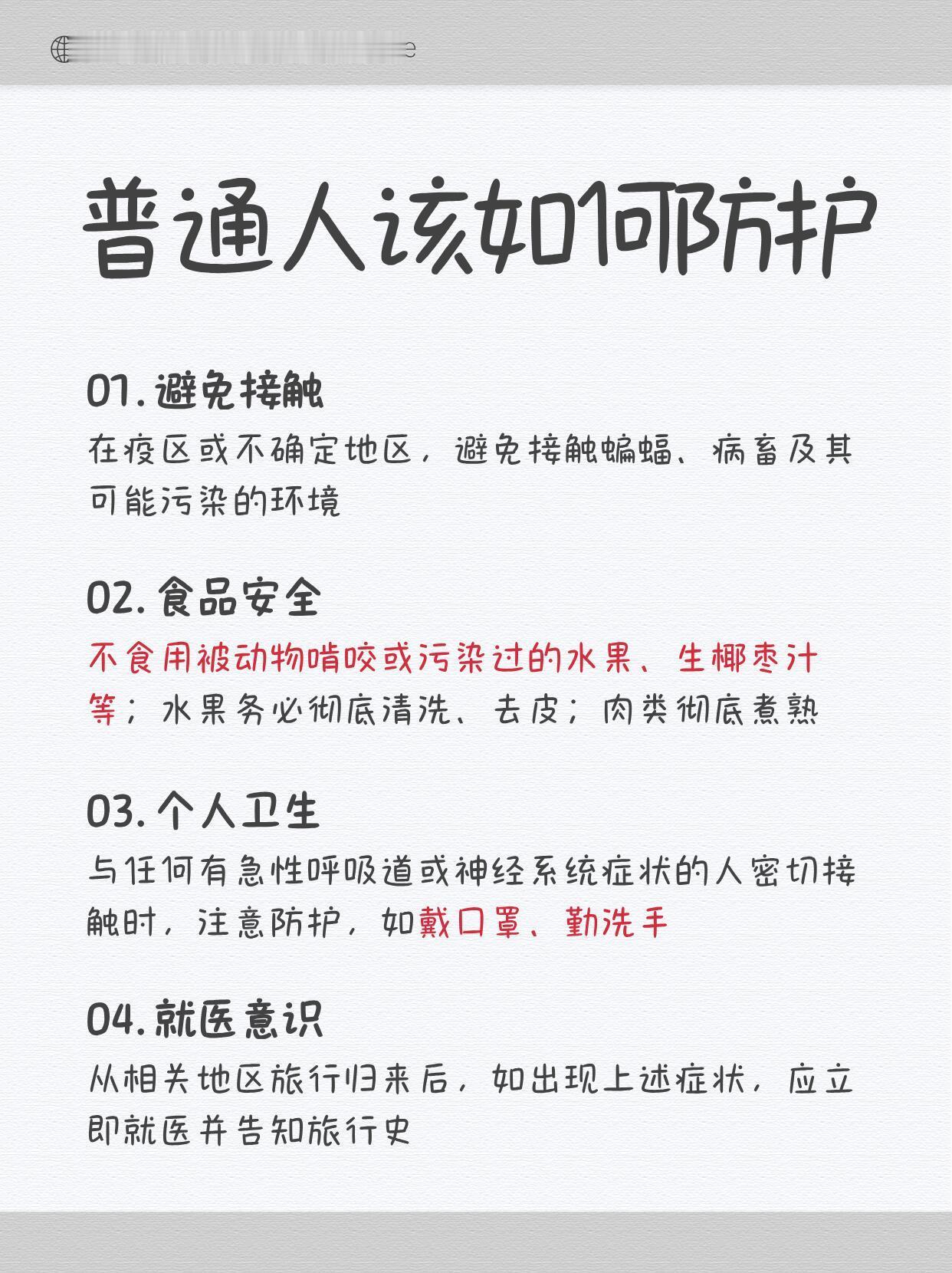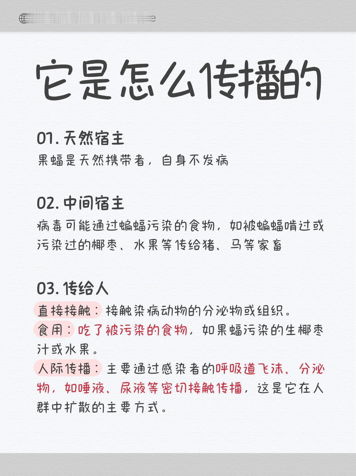 尼帕病毒是个挺危险的东西。它主要在动物和人之间传染,死亡率特别高,能达到40%到75%,而且现在还没什么特效药能治。 这病毒是果蝠身上天然带有的,但蝙蝠自己不会发病。它可能通过蝙蝠污染的食物或者口水,传给猪啊、马啊这些家畜。人要是接触了生病动物的分泌物,或者吃了被污染的食物,甚至通过感染者的飞沫,都有可能被传染。 感染之后,一开始会发烧、头痛、肌肉酸痛、喉咙痛,还可能会吐。严重起来就会头晕、嗜睡、意识模糊,甚至引发脑炎,伤害神经系统。 怎么防呢?首先离蝙蝠和生病的动物远点,它们待过的地方也少去。别吃被动物咬过或者污染的食物,水果一定洗干净、最好去皮,肉要彻底做熟。平时注意戴口罩、勤洗手。要是从有这病毒的地区回来,出现了上面说的那些症状,赶紧去医院,并且告诉医生你去过哪里。 总之这病毒虽然听起来吓人,但注意好防护,不吃来历不明或者被动物碰过的东西,风险还是可以控制的。不用过度恐慌,但该小心的不能马虎。