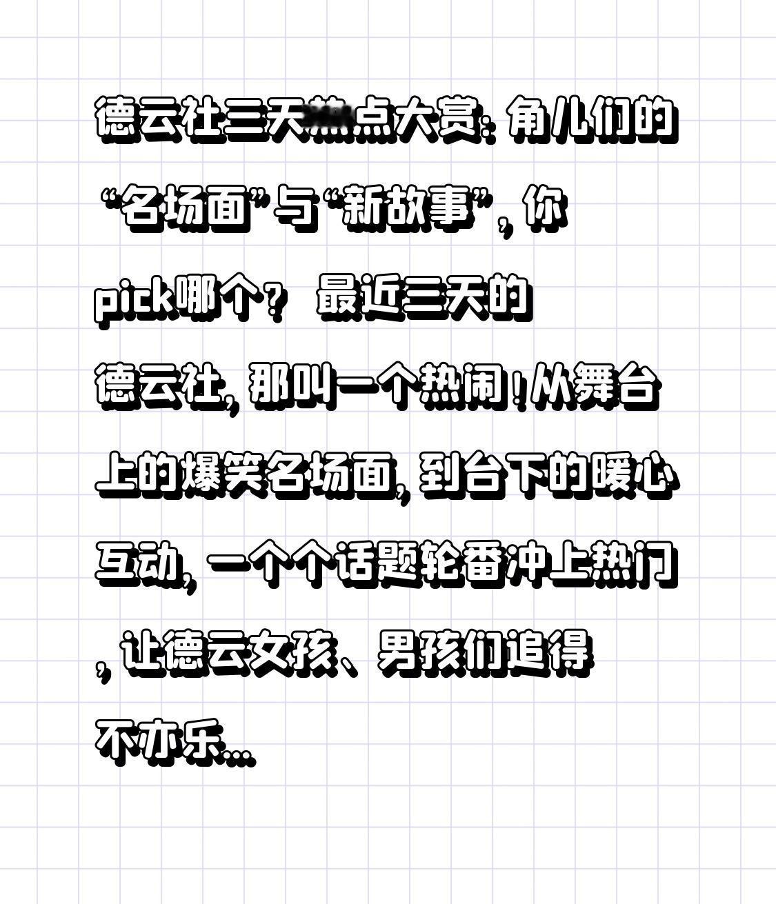 德云社三天热点大赏:角儿们的“名场面”与“新故事”,你pick哪个? 最近三天的德云社,那叫一个热闹!从舞台上的爆笑名场面,到台下的暖心互动,一个个话题轮番冲上热门,让德云女孩、男孩们追得不亦乐乎。 先说最炸的一个——张云雷新专场的“神改编”。在最新一场专场里,张云雷把经典小曲《探清水河》来了个“现代化升级”,融入了当下流行的网络热梗,一句“我滴那个亲娘嘞,这届观众太难带”,直接让全场笑到打鸣。有观众录了片段传到网上,网友们纷纷调侃:“辫儿哥这是把抖音热搜揣进了大褂口袋啊!”更绝的是,他还现场教学“德云式比心”,手势别致又魔性,瞬间成了粉丝圈的模仿爆款,打开社交平台,满屏都是“张云雷同款比心”,这热度,绝了! 再说郭德纲、于谦的“老两口式拌嘴”。在一场商演里,于谦老师台上忘词,老郭当场“拆台”:“于老师这是提前进入养老模式了?”于谦不慌不忙回怼:“我这是给你机会多表现表现,不然观众都忘了你才是主角。”两人一捧一逗,把舞台变成了“相声夫妻的日常”,台下观众乐得前仰后合。这段互动被剪成短视频,网友评论:“这哪是说相声,明明是德云社版《老夫老妻的浪漫》!” 还有个暖心话题也火了——秦霄贤给粉丝“买单”。有粉丝在剧场外买零食,没带现金正着急,恰巧被秦霄贤碰到,他二话不说就帮粉丝付了钱,还笑着说:“就当是德云女孩的专属福利了。”这事被粉丝发到网上,大家纷纷为老秦的暖心点赞,“秦霄贤的温柔,是刻在骨子里的”“这样的角儿,谁能不爱”,评论区里满是对他的夸赞,这波路人缘,赚麻了! 这三天的德云社,既有舞台上的创新与爆笑,又有私下里的温暖与真诚。无论是张云雷的“潮流改编”,还是老郭于谦的“相爱相杀”,亦或是秦霄贤的暖心举动,都让我们看到了德云社不止有相声,更有一群鲜活、有温度的“角儿”。 你最近被德云社哪个热点戳中了?是为张云雷的新段子笑到拍大腿,还是被老秦的暖心行为暖到了?快来评论区聊聊,看看谁是德云社的“热点捕捉达人”!
