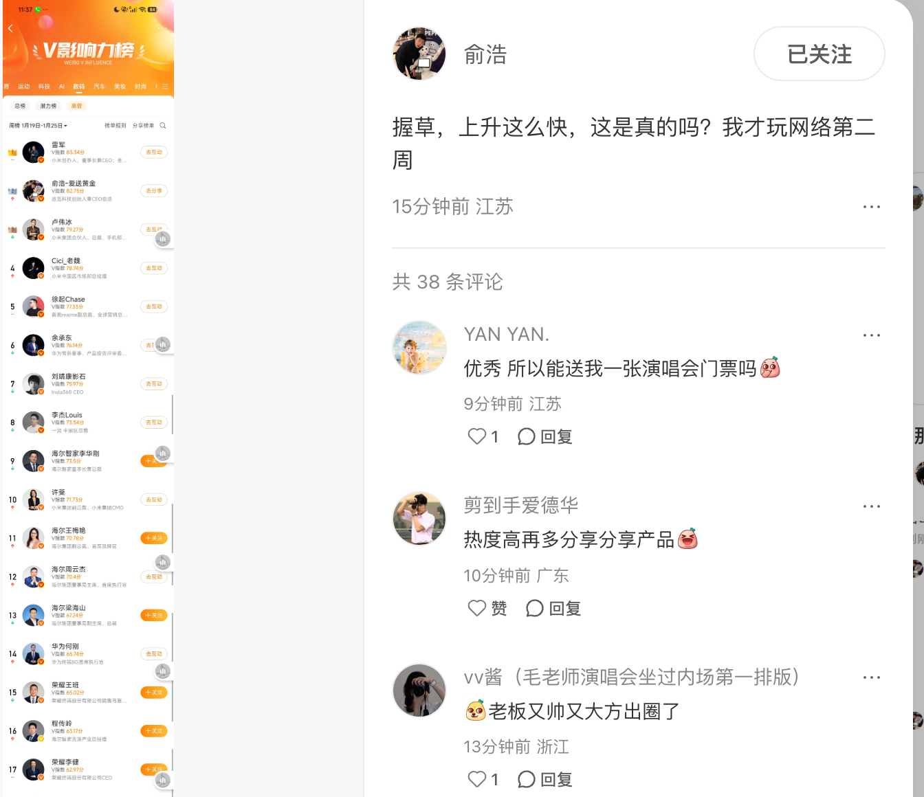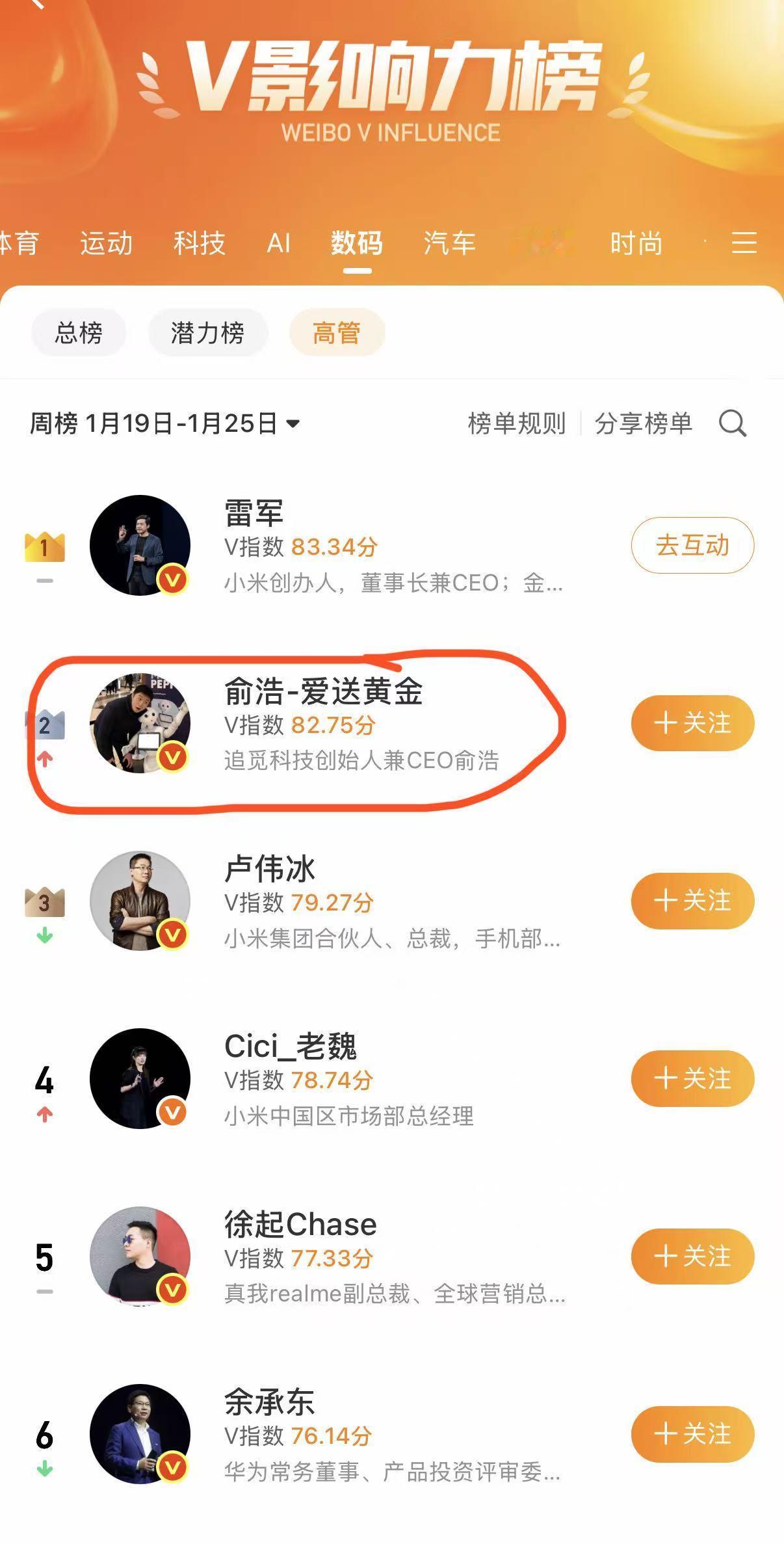 今日,追觅科技创始人兼CEO俞浩晒图显示,俞浩在上周(1月19日-1月25日)冲到微博V影响力榜数码领域下的高管榜单第2名,第一名是雷军。