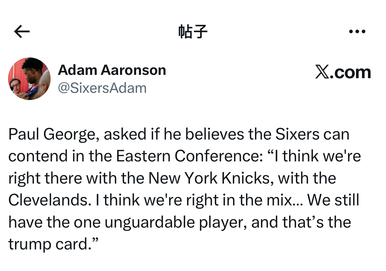 保罗·乔治赛后接受采访时,被问及是否认为76人队能在东部联盟具备竞争力——“我认为我们与纽约尼克斯队、克利夫兰骑士队处于同一水平。我觉得我们已经完全进入了竞争行列…我们队里还拥有一位几乎无法被防守的球员,那就是我们的王牌。”谈及自己本赛季对阵雄鹿队的出色表现——“我只是了解道格·里弗斯。我了解他的执教思路,熟悉他的防守布置,清楚他的战术安排,也知道他会如何观察场上的情况、追求怎样的攻防效果,以及他会用怎样的策略来限制我。”费城76人冬日热情篮不住PaulGeorge保罗乔治