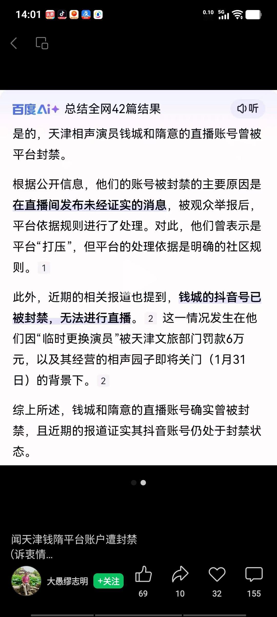 天津的钱隋开窍组合,可谓祸不单行。在被罚款6万之后,他们又遭到了永久封号的处罚,这真可谓善恶到头终有报,完全是咎由自取。 自开播以来,这两个小子没大没小,公然评判老前辈,口无遮拦不说,还发布不实消息,令广大观众极为不满。他们的直播行为触碰了他人不敢触碰的红线,想来曲协也是忍无可忍了。倘若任其发展下去,曲艺界必将被他们搅得一塌糊涂。这两个无名小辈,为了出名、挣钱简直是疯了,净说些有碍观瞻的话。 好在这次平台出手及时,为净化网络、弘扬正气,就必须对这类行为予以严厉打击。