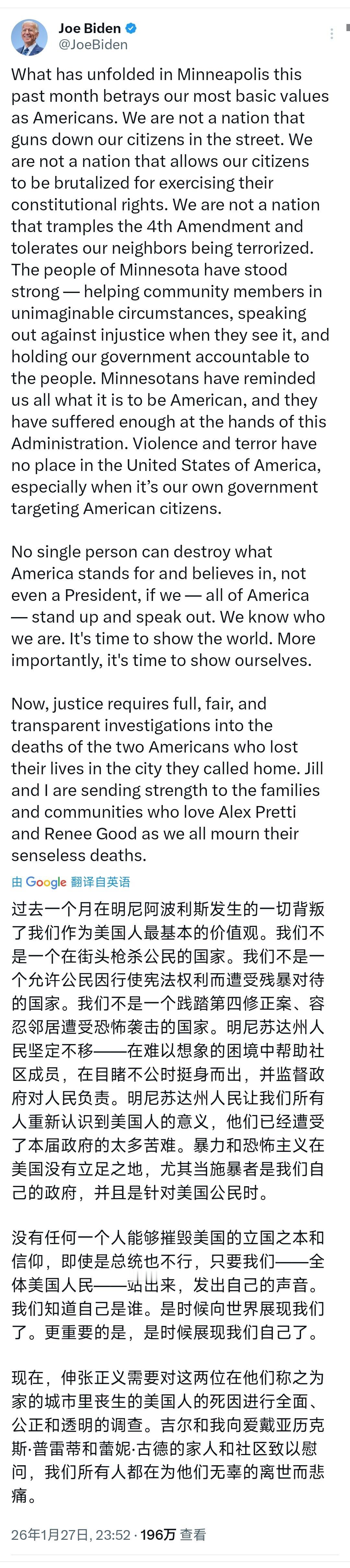 久未露面的美国前总统拜登昨晚(北京时间1月27日晚)发文批评特朗普政府:过去一个月在明尼阿波利斯发生的一切背叛了我们作为美国人最基本的价值观。我们不是一个在街头枪杀公民的国家。 拜登这波发文表面上是为明尼阿波利斯的死者讨公道,指责特朗普政府践踏美国价值观,实际上里面既有对暴力执法的真实不满,也藏着不少政治门道。 拜登文中提的两位死者,蕾妮·古德和亚历克斯·普雷蒂,都是美国公民,死得都挺冤,而且都是被美国移民与海关执法局(ICE)的人打死的。 1月7号先出的事,蕾妮当时就是个合法观察员,看着ICE在街头执法,结果被执法人员拦车,最后连中三枪,头部还被打穿了。 ICE那边张口就说蕾妮试图开车冲撞他们,是“暴力骚乱者”,自己是自卫开枪,可明尼阿波利斯市长直接怼回去,说这就是胡说八道,现场视频根本没显示蕾妮要撞人,人家顶多就是想开车离开,压根没对执法人员构成威胁。 更让人膈应的是,蕾妮死后有医生想上前救人,还被ICE的人呵斥着赶走了,这操作哪有半分执法者的样子。 这事儿还没平息,1月24号又出了人命,37岁的护士亚历克斯在距离蕾妮死亡现场2公里的地方,又被ICE执法人员开枪打死了。 这次ICE的说法还是老一套,说亚历克斯持枪靠近,想屠杀执法人员,他们自卫才开枪。 可现场多段视频拍得明明白白,亚历克斯手里根本没枪,当时他正用手机拍执法人员,还想保护被执法人员推倒的女子,结果被推倒、喷辣椒水,混乱中就被打死了,前后至少响了10声枪响。 亚历克斯家人气得不行,说他当时一手拿手机一手举过头顶,就是想劝架,ICE的说法纯属令人作呕的谎言,而且亚历克斯本身有合法持枪许可,真要动手也不至于毫无防备。 拜登说这是践踏第四修正案,这话还真没说错,不是空喊口号,美国第四修正案本来是保护公民不受不合理搜查和扣押的,可ICE现在有个所谓的“行政搜查令”,压根不用法院批准,自己人签字就能随便闯民宅执法。 这就等于行政部门自己给自己授权,既当运动员又当裁判,想查谁就查谁,完全没监督,专家都明确说了,这就是赤裸裸违宪。 更离谱的是,ICE执法还搞种族定性,亨内平县治安官都证实,ICE好几次就因为人家肤色不一样就拦下来盘查,邻近城市的警察也说,好多有色人种都被这么对待过,连休班的警员都没能幸免,曾被ICE人员用枪指着威胁。 特朗普政府对这两起事件的态度,也难怪拜登要发文批评,特朗普自己都站出来支持ICE的说法,还转发视频说蕾妮恶意撞人,可那视频里压根没ICE人员被撞的迹象,纯粹是混淆视听。 国土安全部部长更过分,直接把蕾妮的行为说成是“国内恐怖主义”,不仅不认错,还往明尼苏达州增派了几百名警员,摆明了要硬刚到底。 拜登这会儿站出来发声,时机选得很巧,他久未露面,借着这事儿既能树立自己维护公民权利、坚守价值观的形象,又能精准打击特朗普政府的痛点。 要知道,现在美国民众对ICE的不满已经堆到顶了,民调显示60%的人觉得ICE执法过度,56%的成年人认为打死蕾妮的执法人员使用武力不当,还有一半以上的人觉得这不是孤立事件,是ICE运作模式有深层次问题。 拜登抓着这个点说话,无疑是踩中了民众的情绪,而且他特意强调“施暴者是我们自己的政府”,就是要把矛盾直指特朗普政府,暗示对方破坏了美国的立国之本,这明显带着政治博弈的味道,毕竟特朗普一直以强硬执法为卖点,拜登这波就是反过来打他的脸。 不过咱也得客观说,拜登的话里也有几分真情绪,美国一直标榜自己讲人权、讲法治,结果现在执法人员在街头随便枪杀公民,还编瞎话掩盖真相,连合法公民的基本安全都保障不了,这确实打了所谓“美国价值观”的脸。 明尼阿波利斯的民众也确实够难的,ICE执法搞得到处人心惶惶,连孩子上学都受影响,大家挺身而出抗议、监督政府,这事儿本身就透着无奈。 拜登呼吁全面、公正、透明的调查,既是给死者家属一个交代,也是给愤怒的民众一个说法,这部分诉求是实实在在的,不是纯粹的政治作秀。 有意思的是,这事儿也暴露了美国的体制乱象,一边是联邦政府硬扛着不认错,还在不断加码执法;一边是地方政府强烈反对,甚至请国民警卫队来制衡,上下级闹得不可开交。 而且ICE这种过度执法不是一天两天了,之前就有超过170名美国公民被他们误拘,有的还被粗暴对待关押好几天,连孩子都被当作诱饵用来抓捕家长,家庭分离的事儿屡见不鲜。 拜登说“暴力和恐怖主义在美国没有立足之地”,可当施暴者是政府本身时,想要伸张正义就难多了。 毕竟ICE的执法权不受制约,特朗普政府又一味包庇,所谓的调查能不能做到公正透明,还真不好说。 说到底,拜登这篇发文,一半是为民发声、指责不公,一半是借题发挥、敲打对手,他久未露面,需要这样一个有分量的话题重新回到公众视野,既展现自己的立场,又收割民众的好感。