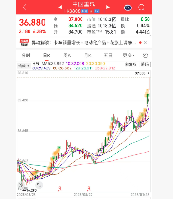 上证报中国证券网讯(记者李五强)1月28日,中国重汽H股继续走强,截至15时03分,报36.88港元/股,涨6.28%,股价继续创历史新高,市值首次突破1000亿港元,今年1月份以来该股累计涨幅已超30%。