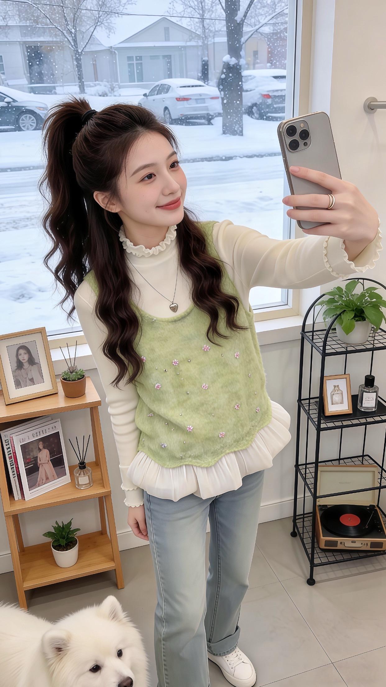 温柔粉嫩少女风,粉色毛衣搭配蕾丝围巾,甜美动人!💖✨