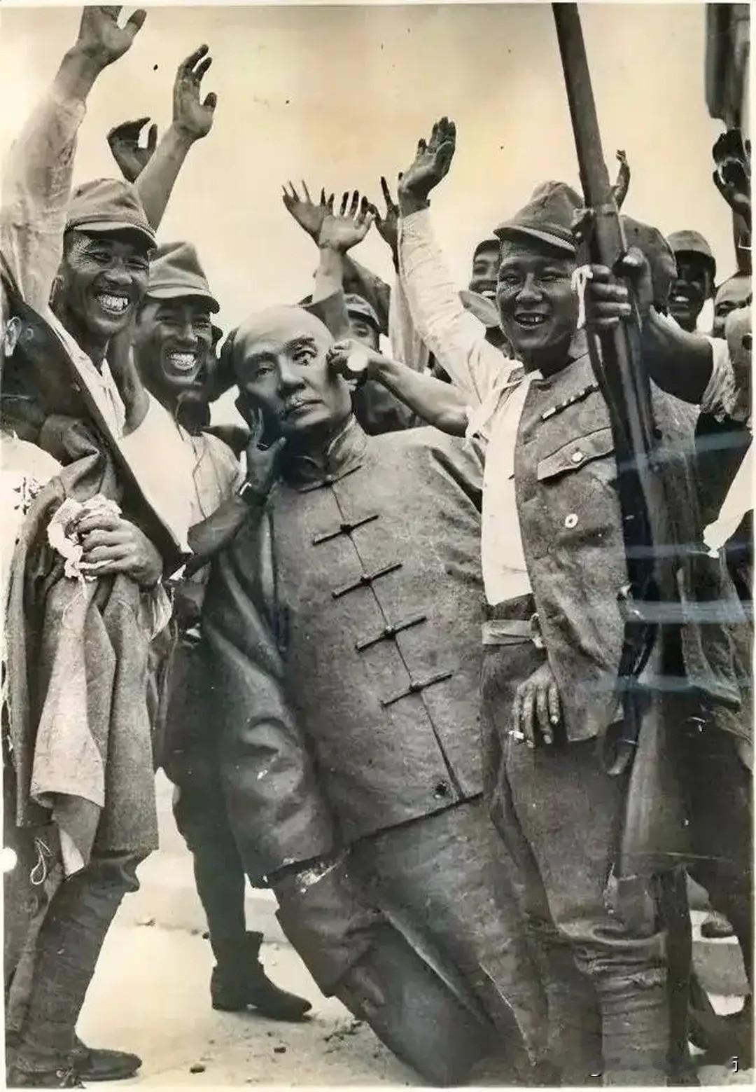 1937年,日军占领南京时推倒孙中山雕像并盖上青天白日旗的场景。值得庆幸的是,