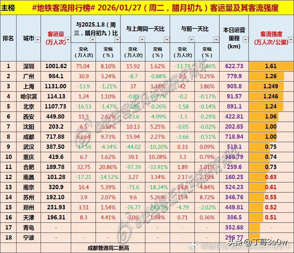 上海周二地铁客流量1131万人次,重返全国排名第一位置[呲牙][呲牙][呲牙] 爆料 身边事 地铁客流排行榜 中国地铁客流日报 昨日客流 排行榜 周二 上海 2026年1月27日 星期② 全国重点城市轨道交通客流量排行榜: 上海:1131.00万 北京:1107.73万 深圳:1001.62万 广州:984.10万广州爆料 成都:717.88万 西安:449.80万西安地铁 重庆:419.60万重庆身边事 武汉:387.50万武汉爆料 南京:320.90万 郑州:231.93万郑州地铁 沈阳:203.20万沈阳地铁 天津:196.32万 苏州:192.10万苏州爆料 合肥:189.78万合肥身边事 青岛:114万+青岛地铁 宁波:114万+ 哈尔滨:114.13万哈尔滨爆料 南昌:101.28万
