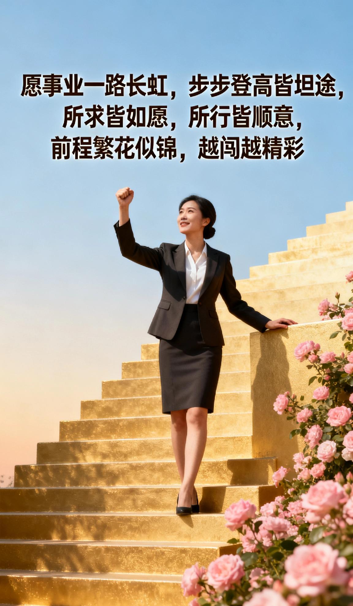 事业一路长虹 愿事业一路长虹,步步登高皆坦途,所求皆如愿,所行皆顺意,前程繁花似