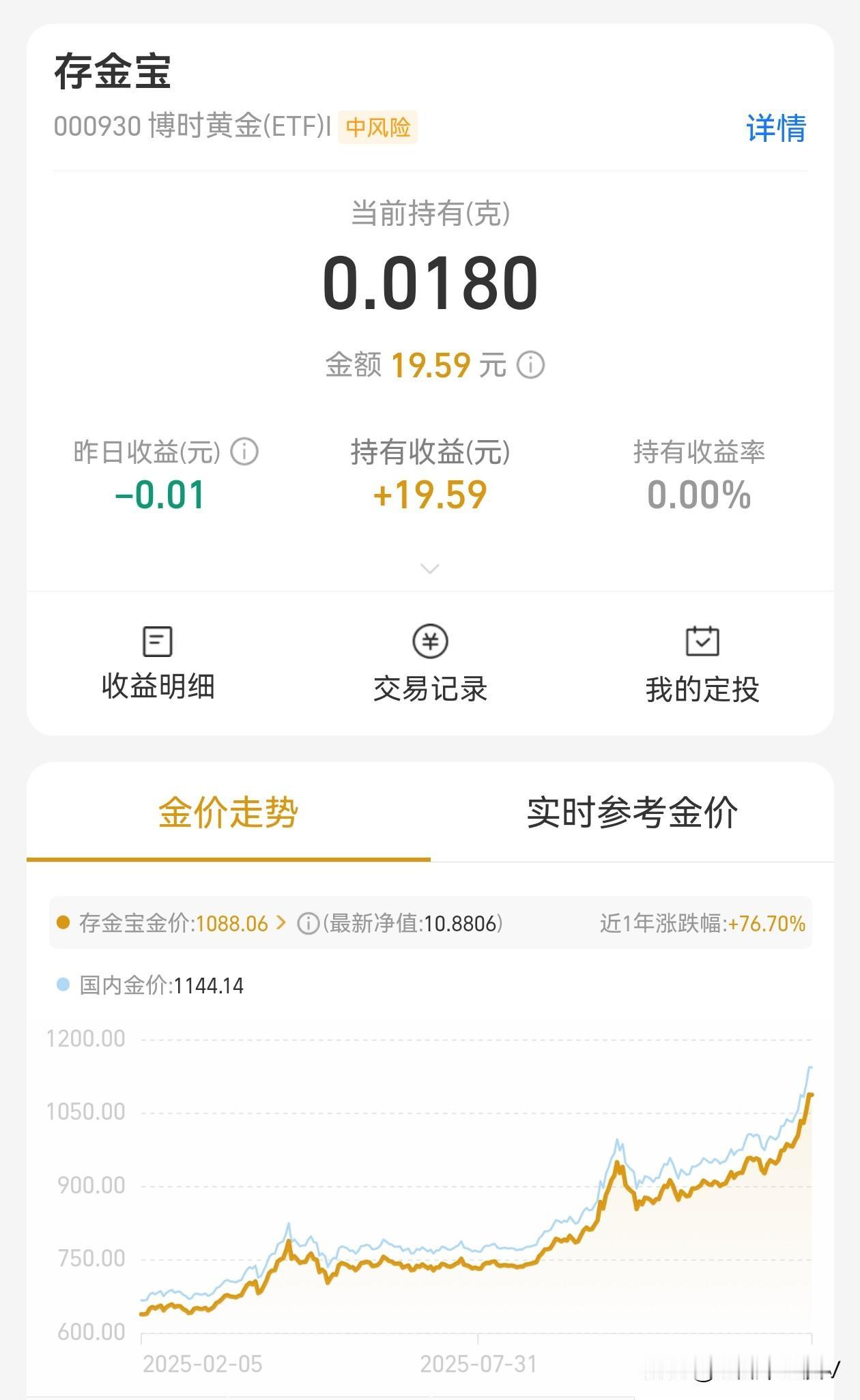 真是没有发财命啊!看了一眼支付宝账户的黄金,算了一笔账,真是肠子都悔绿了。原来自己 17 年就有黄金了,那时候金价差不多两三百每克吧,支付宝做活动送了 0.018 克,现在收益 19.59 元。假如说我当时买了 100 克黄金,最多三万块钱,现在收益差不多将近 20 万了,不算不知道,一算吓一跳。可惜没有卖后悔药的啊,其实自己天天都看支付宝,里面的黄金也看到了,就知道没有仔细算算,和这么多钱失之交臂,悔啊! 现在准备开始定投黄金了,准备那个十年二十年,错过了第一班车,不能再错过第二班车了[捂脸]黄金早买早划算
