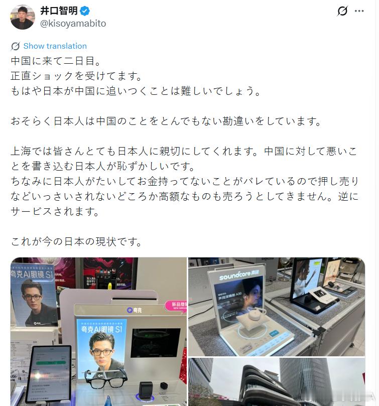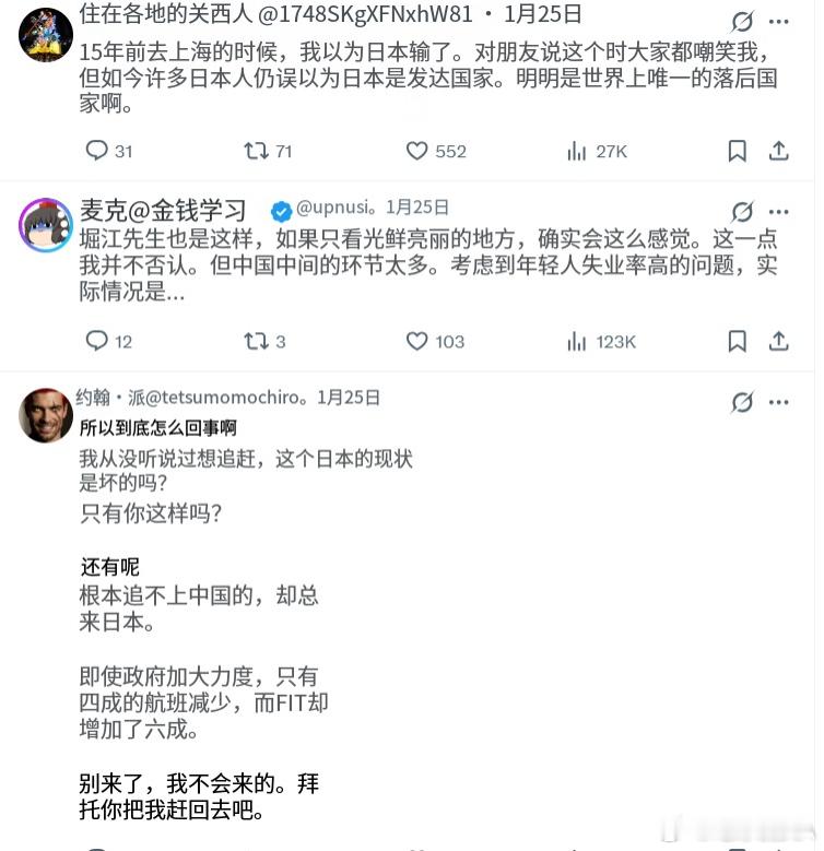 “中国商家懒得给日本人推销商品,因为知道日本人没钱”一名来华旅游日本人的感叹:“来到中国的第二天。说实话,我很震惊。日本恐怕很难再追上中国了吧。或许日本人对中国存在着极大的误解。在上海,大家对日本人非常亲切。那些在网上写中国坏话的日本人真让人感到羞耻。顺便说一下,因为大家都知道日本人没什么钱,所以非但没有强行推销,连高价的东西也不会推销给我们。反而会为我们提供服务。这就是如今日本的现状。”然后,大批鬼子酸友不爽了。。。高市早苗拉票边哭边诉苦日本抗议者大喊高市下台