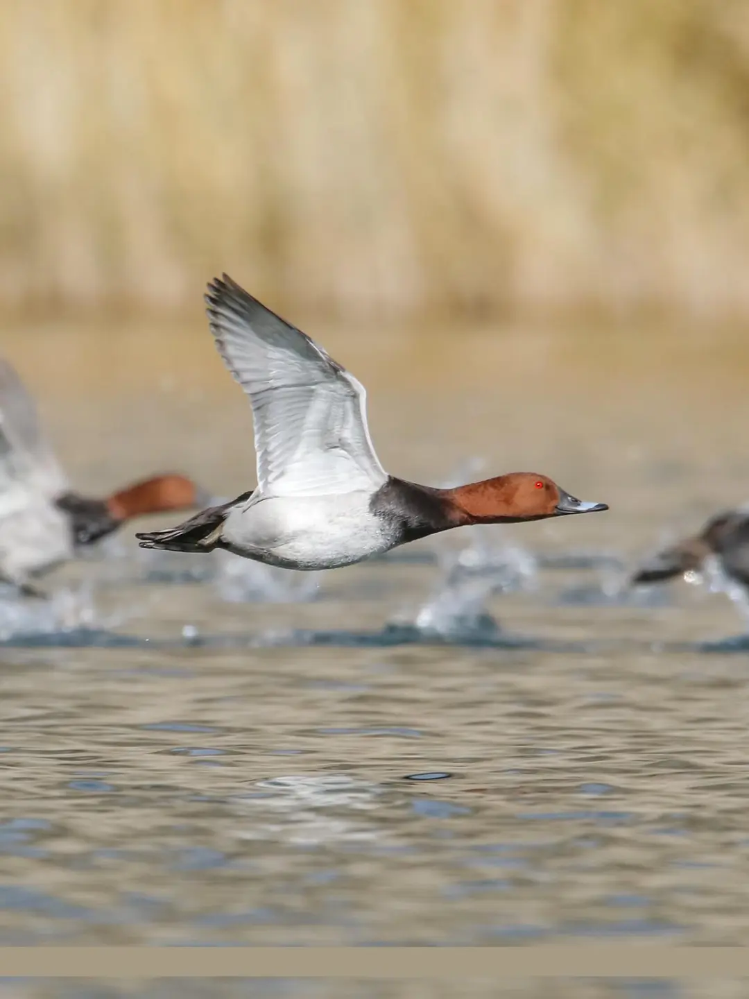 红头潜鸭偏爱水生植物丰富的开阔水域,水库、河流都是它们的理想家园。作为潜水高手,它们觅食时可潜入水下1-3米处,每次可持续10-20秒左右。不过它们胆子比较小,受到惊吓时会迅速潜水躲避,或者拍打翅膀快速飞走。