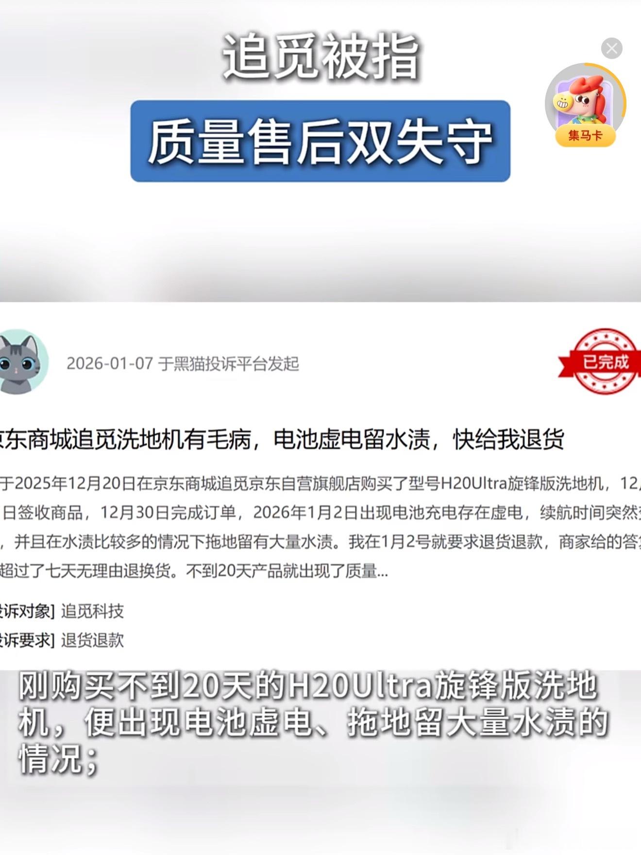 本来大家买扫地机器人、洗地机这种家电,图的就是省心省力,结果不少人花大几千买回来净添堵。再碰上售后推诿、维修不透明,投诉集中爆发也是意料之中的事。其实,只要是电器难免会碰到质量出问题的情况,这事咱都能理解。可要是一大堆用户都在吐槽质量差,那就说明品牌的把关肯定是没做到位。还有售后这块更是重中之重,外包的售后没人好好监管,收费含糊不清,该兑现的三包政策也不落实,时间久了,咱用户的信任迟早会被消耗干净。追觅被指质量售后双失守