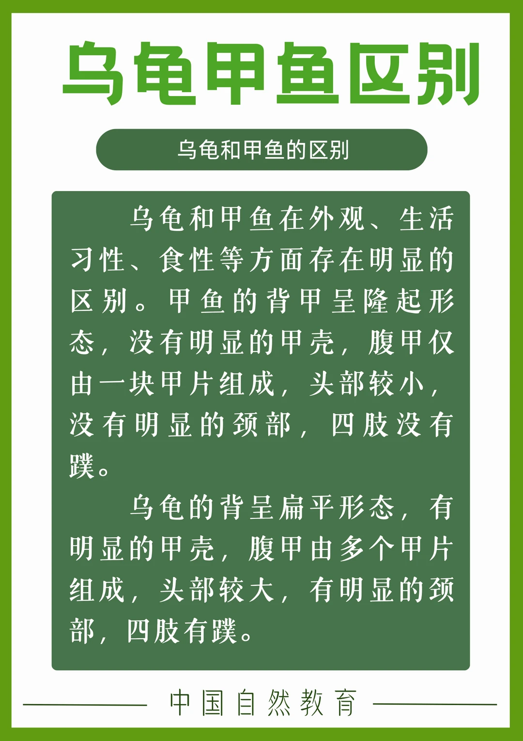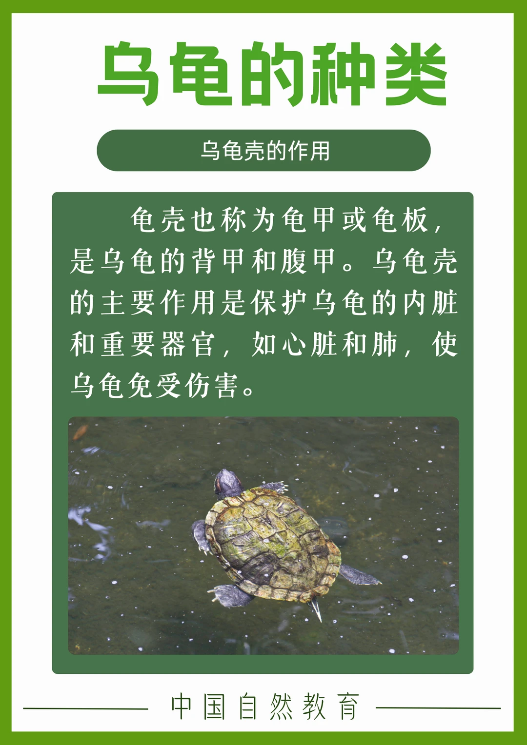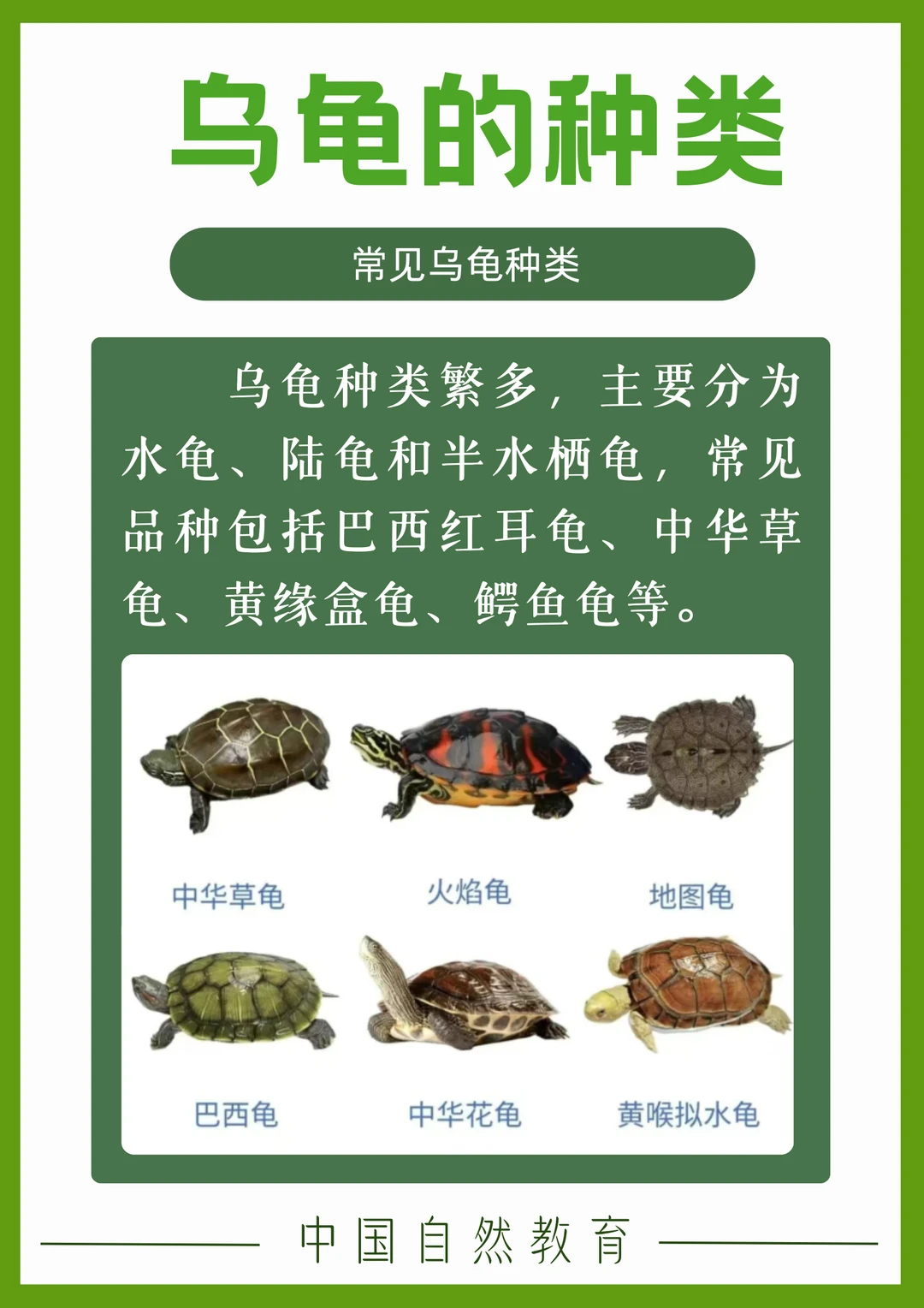 🐢乌龟,相信小朋友都不陌生。它是爬行动物中的一员,以其缓慢的步伐和长寿的特性而著称。 🐢 乌龟也是有雄性和雌性的哦!雄性较小,背甲黑色,尾巴较长且尖,有异臭;雌性较大,背甲棕褐色,尾巴较短平坦。 🐢 乌龟种类繁多,主要分为水龟、陆龟和半水栖龟,常见品种包括巴西红耳龟、中华草龟、黄缘盒龟、鳄鱼龟等。
