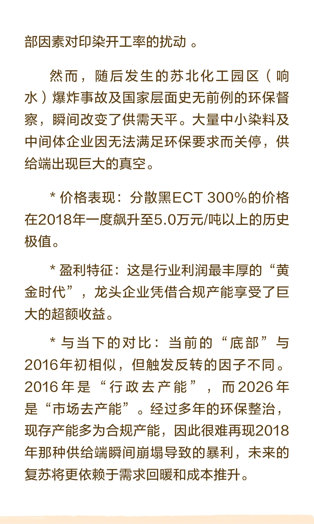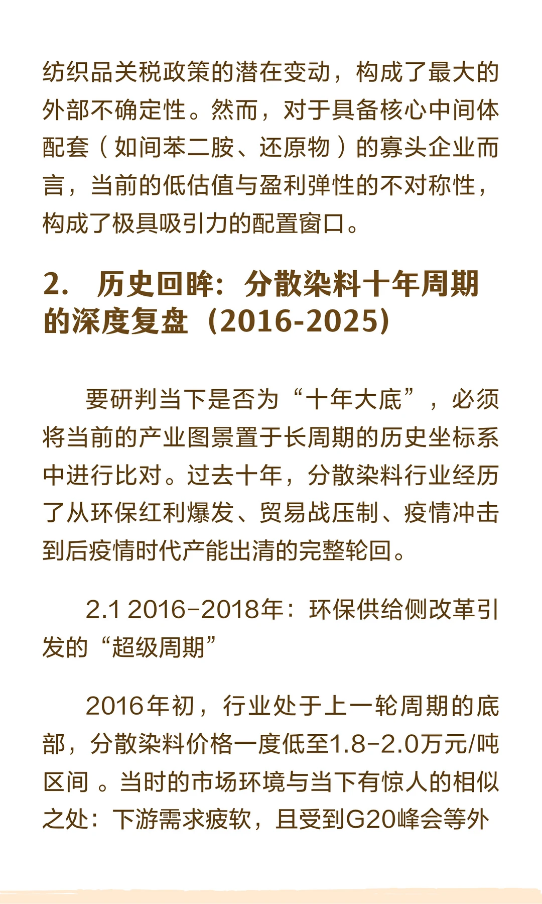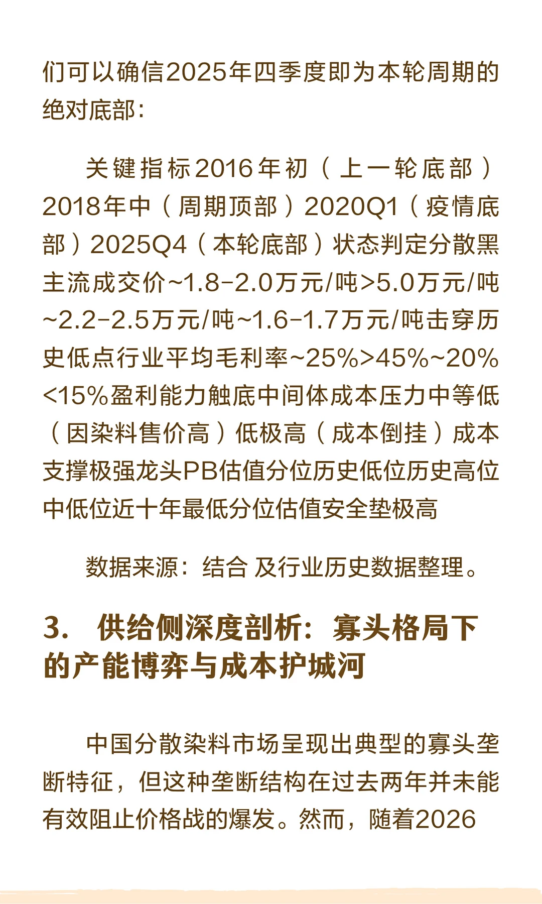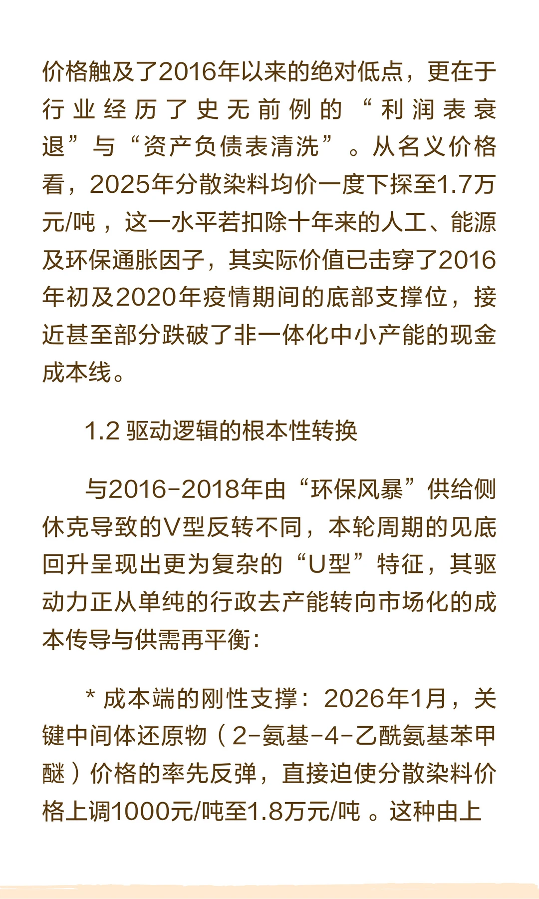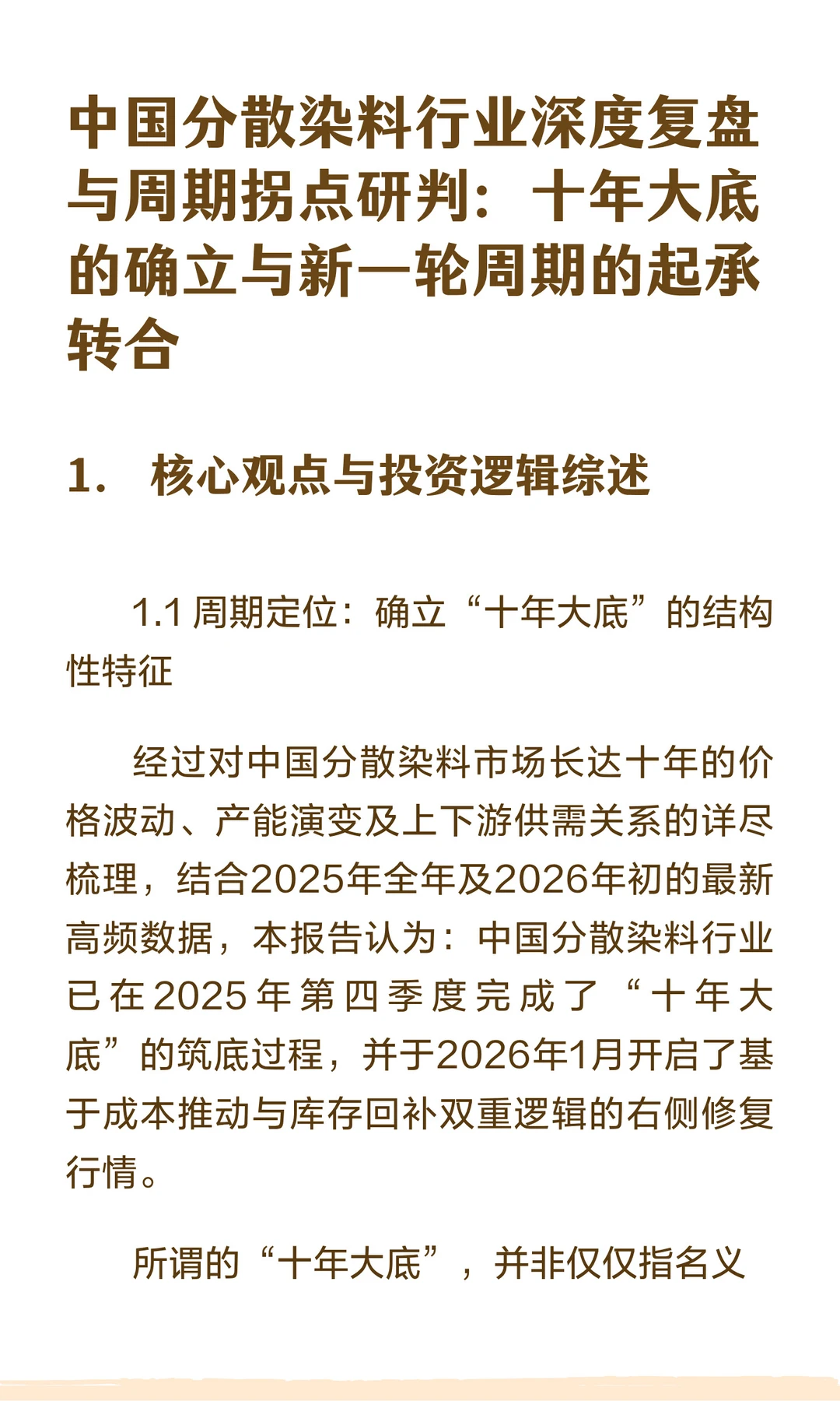 经过对中国分散染料市场长达十年的价格波动、产能演变及上下游供需关系的详尽梳理,结合2025年全年及2026年初的最新高频数据,本研究认为:中国分散染料行业已在2025年第四季度完成了“十年大底”的筑底过程,并于2026年1月开启了基于成本推动与库存回补双重逻辑的右侧修复行情。