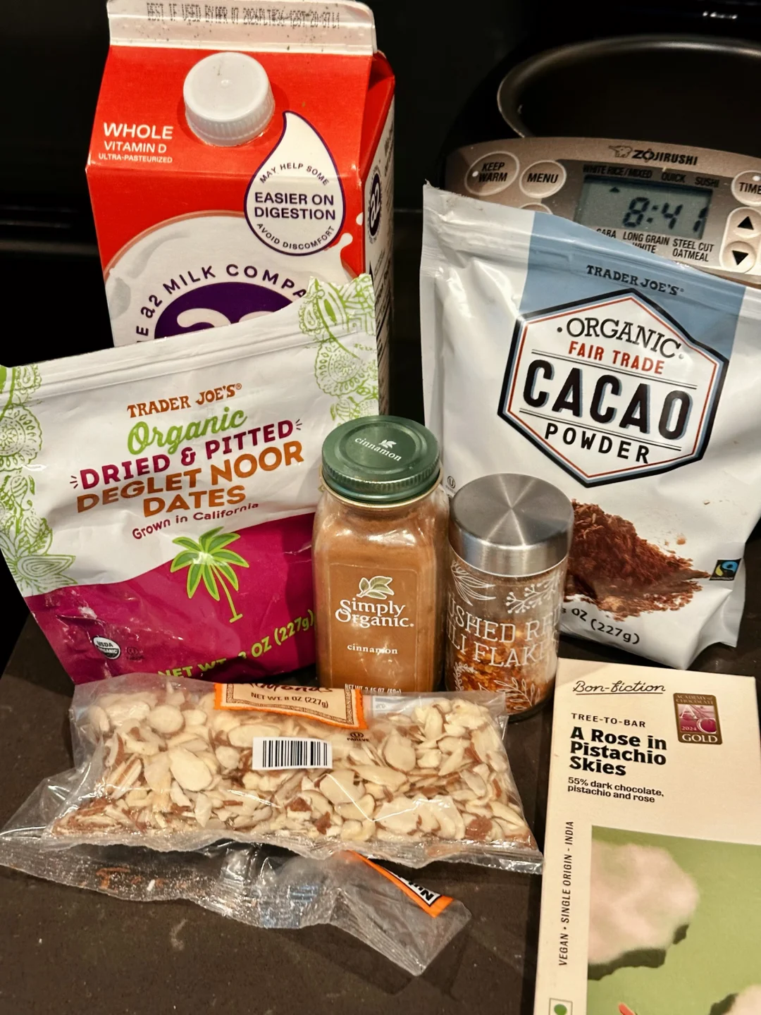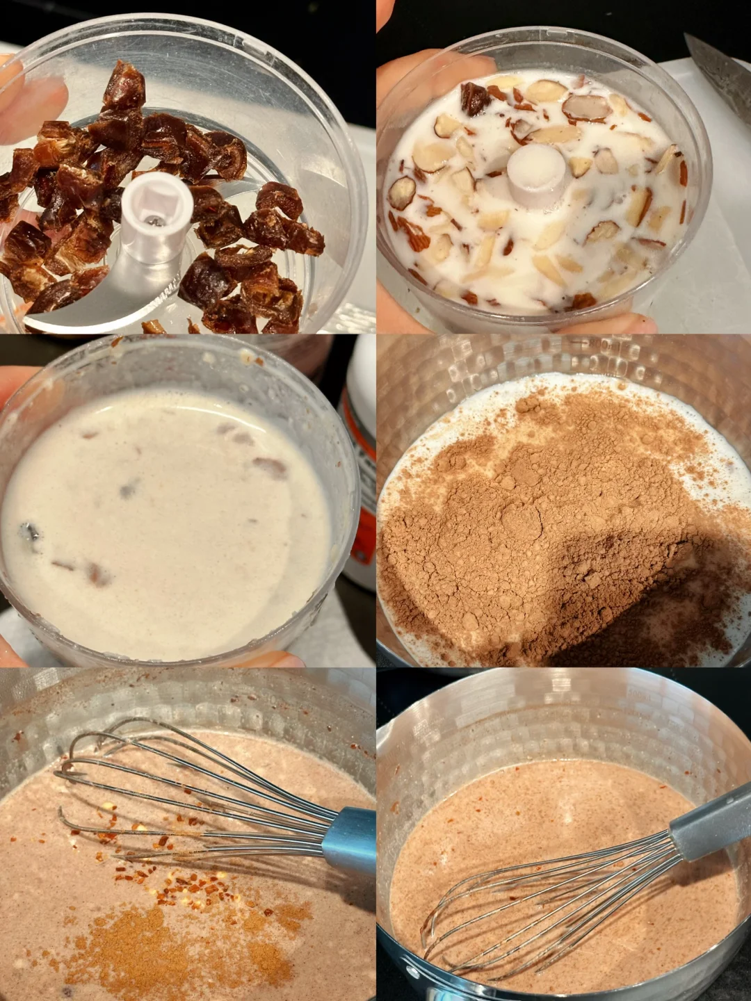 牛奶240ml,椰枣3颗,杏仁/腰果五六颗,可可粉cacao powder2tbsp,肉桂粉,辣椒粉。