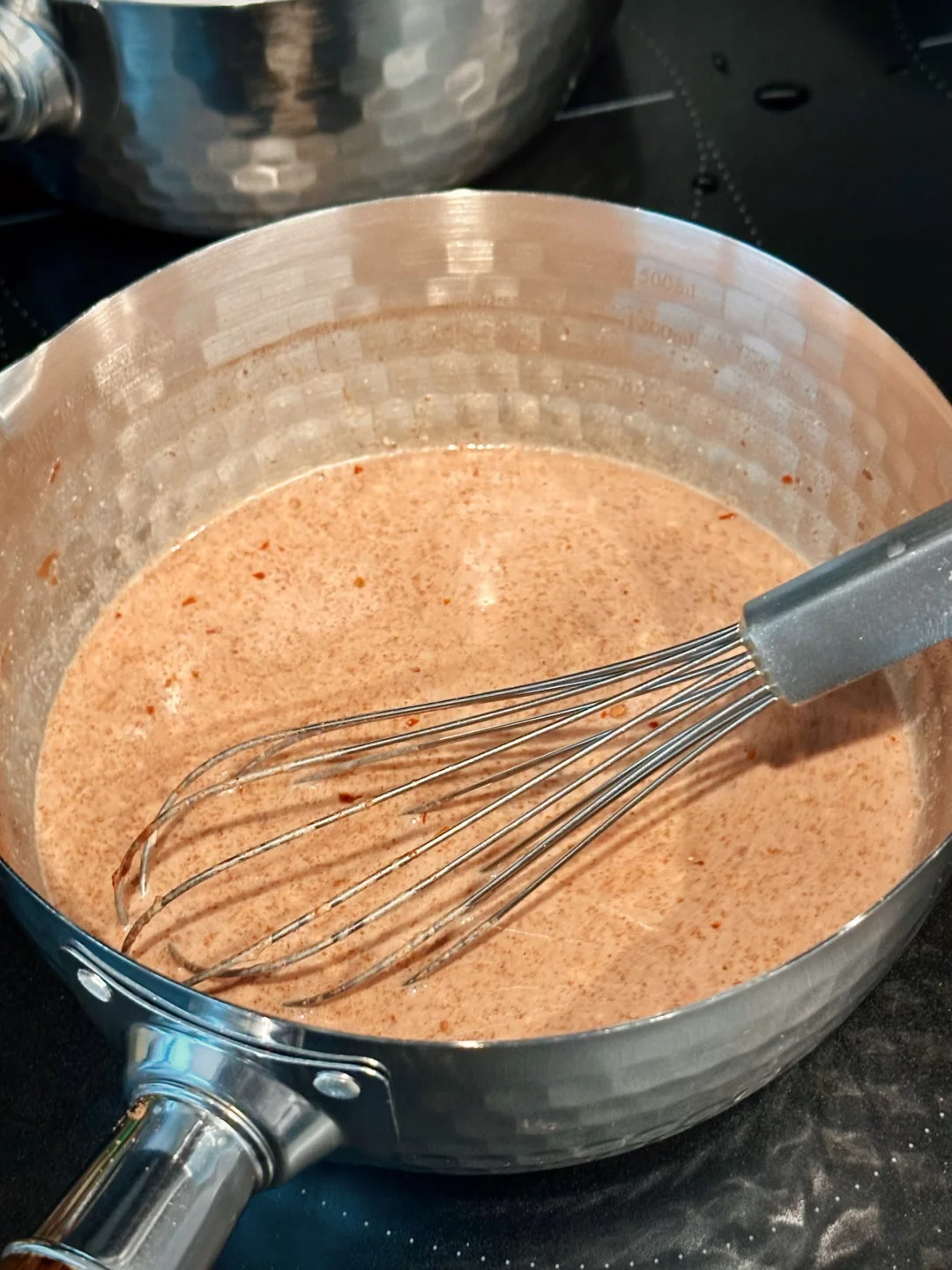 等到可可粉完全融合,并且整体周围冒小泡,稍稍收浓,加一点辣椒粉和肉桂粉调味,就可以出锅啦!
