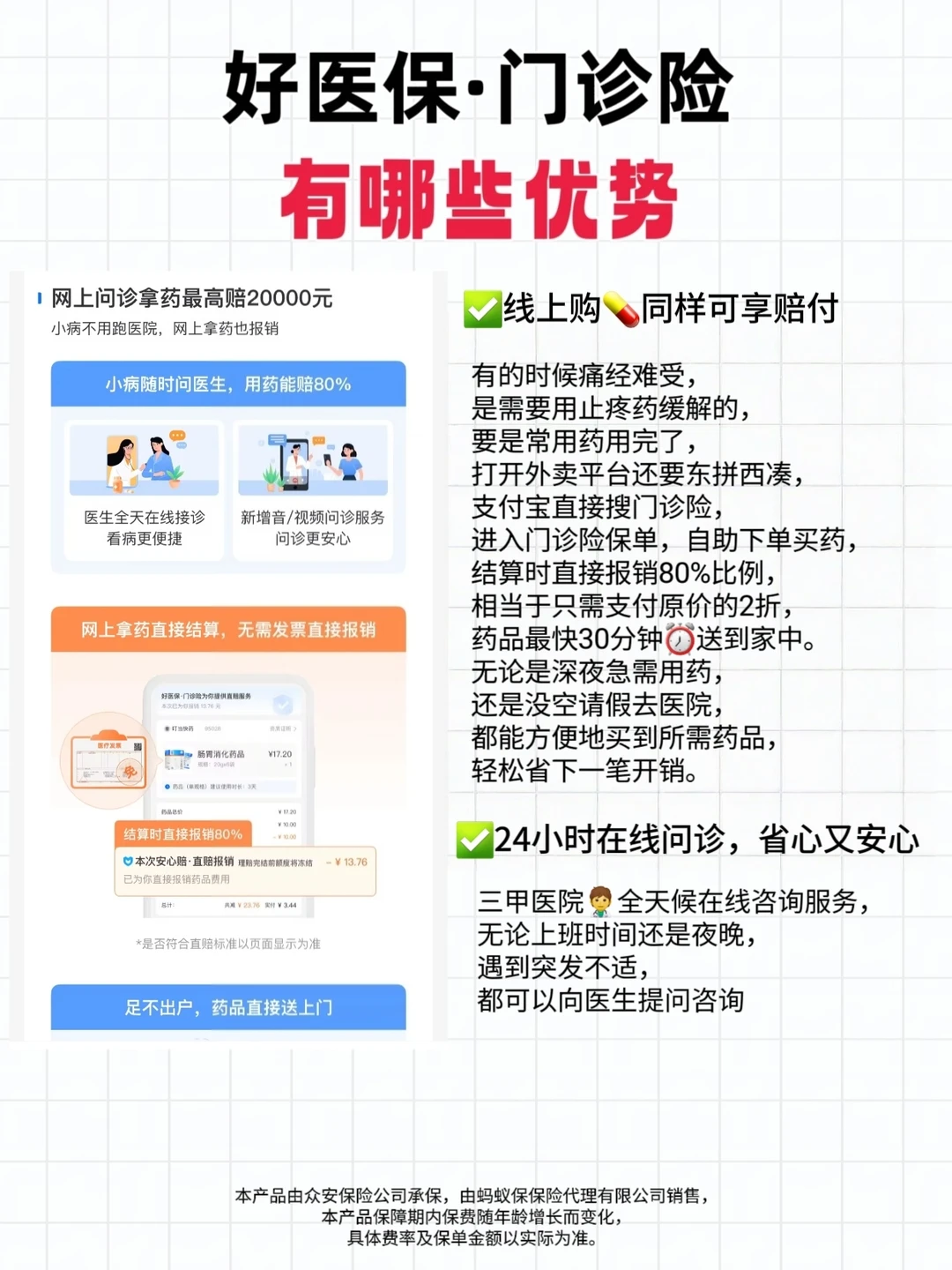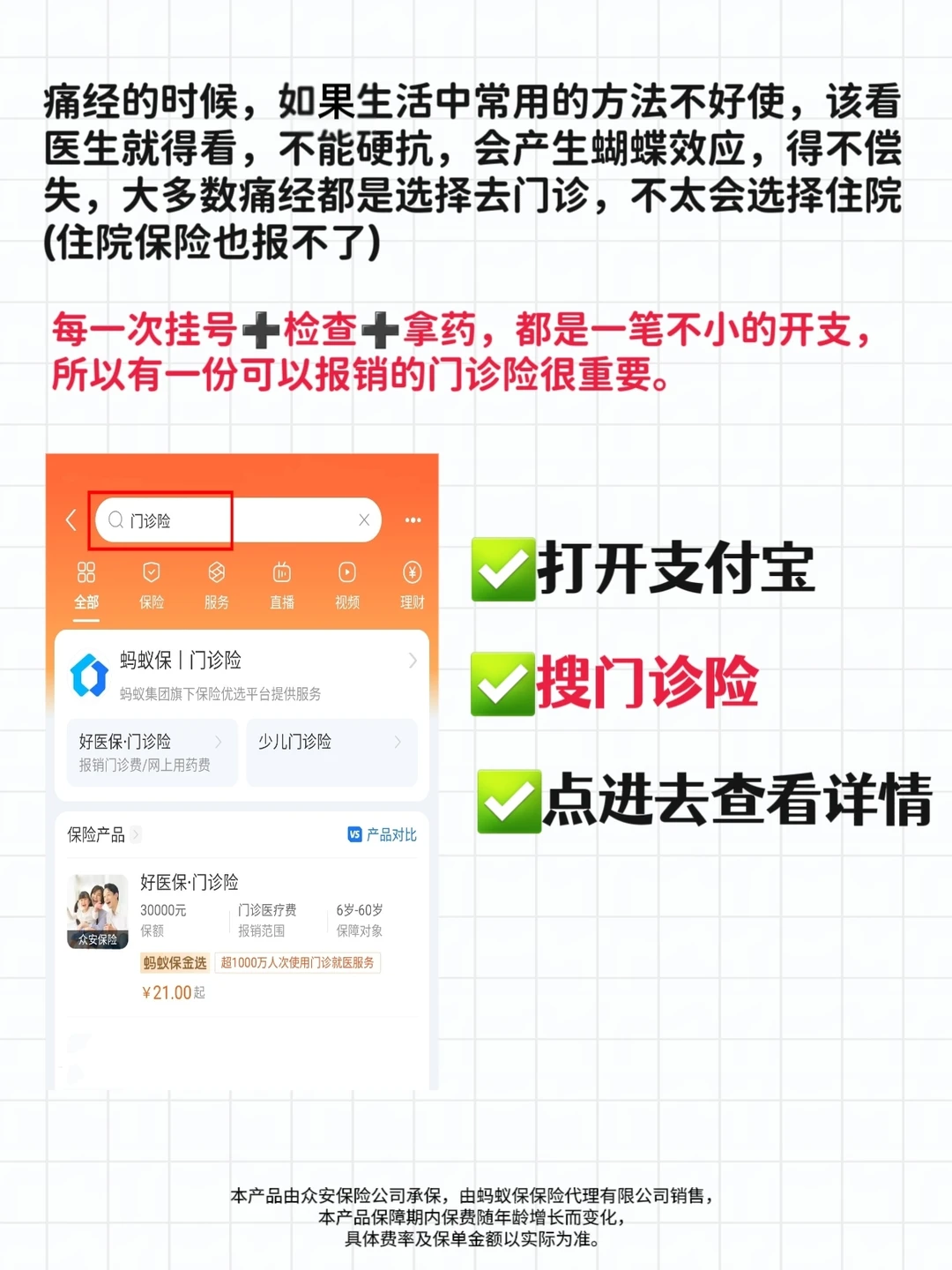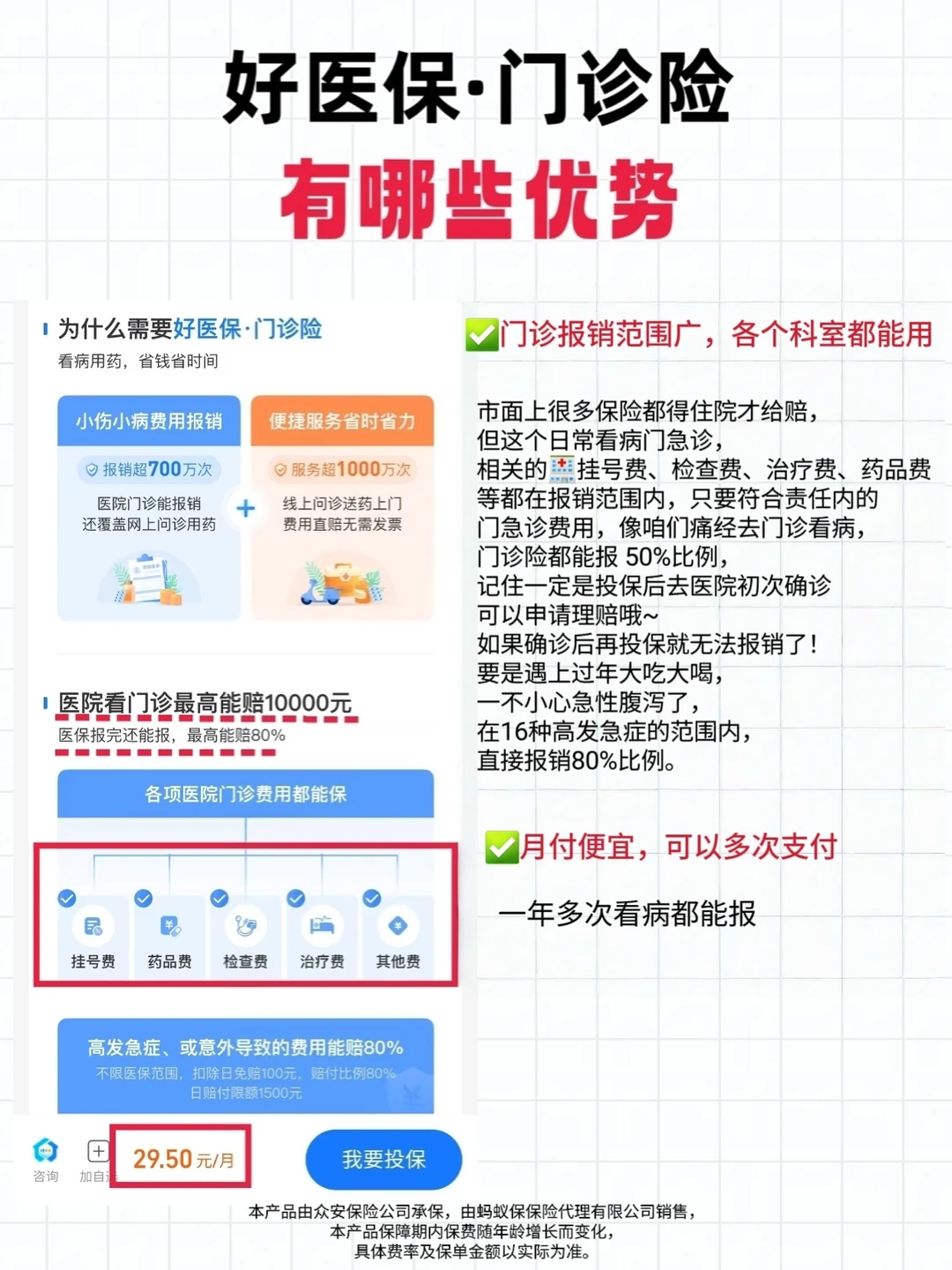 市面上很多保险都得住院才给赔,但这个日常看病门急诊,相关的🏥挂号费、检查费、治疗费、药品费等都在报销范围内,只要符合责任内的门急诊费用,像咱们痛经去门诊看病,门诊险都能报 50%比例,记住一定是投保后去医院初次确诊可以申请理赔哦~如果确诊后再投保就无法报销了!