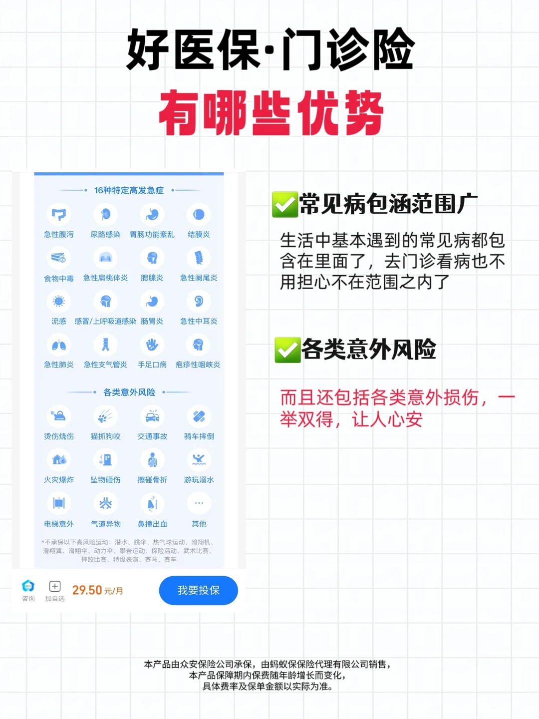 当然门诊险也不是万金油,如果是投保前已经确诊、复发,属于既往症,不报销哦。以及牙科、体检、既往症(如投前已确诊的糖尿病、高血压等)都是不报销的。它有30天等待期(意外7天),提前给自己备上,给自己多一份安心和保障~