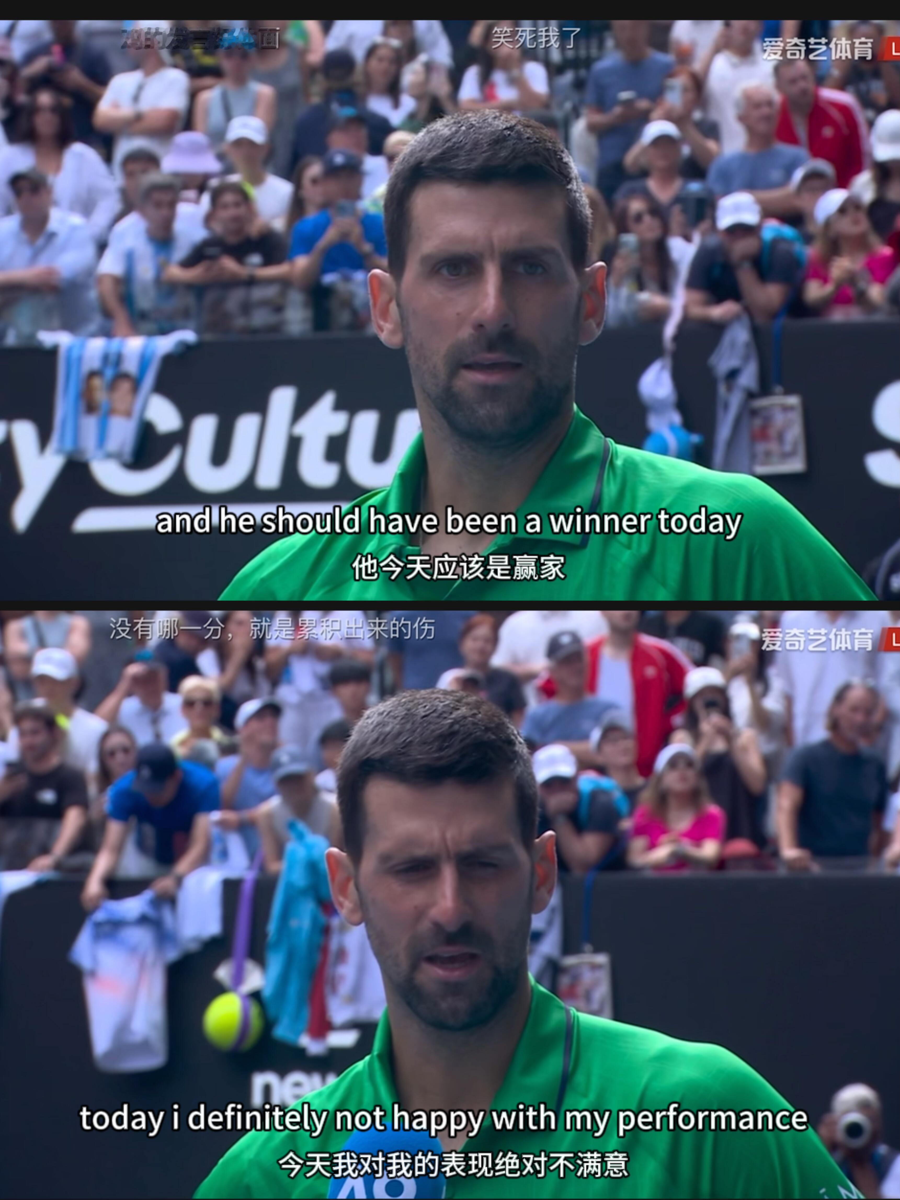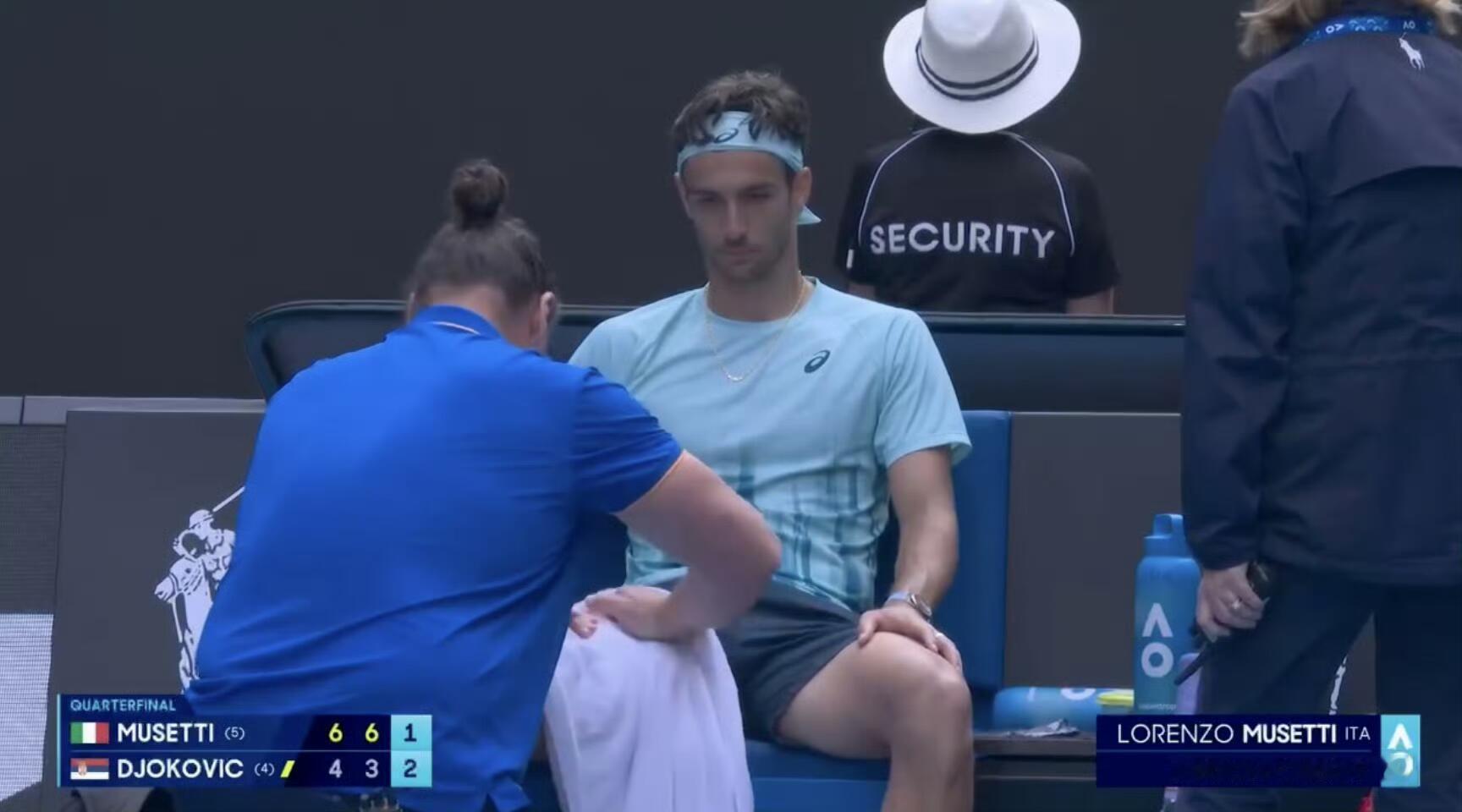 德约4-6/3-6失掉前两盘,第三盘比分来到3-1(40-15) Ret.穆塞蒂叫了医疗暂停⏸️最终选择退赛去年德约退出送穆塞蒂进总决赛,今天穆塞蒂因伤退赛德约科维奇晋级澳网男单四强!德约说穆塞蒂应该是今天赢的那个人,自己准备在回家的路上了。谦虚公正公平或许这也正是体育的魅力!
