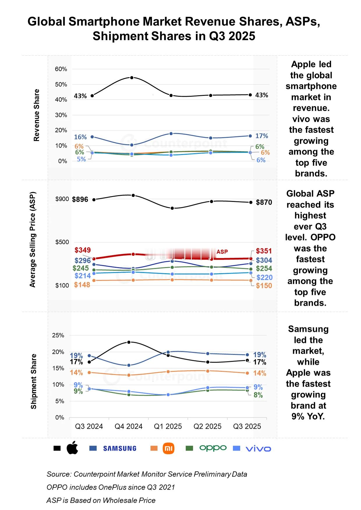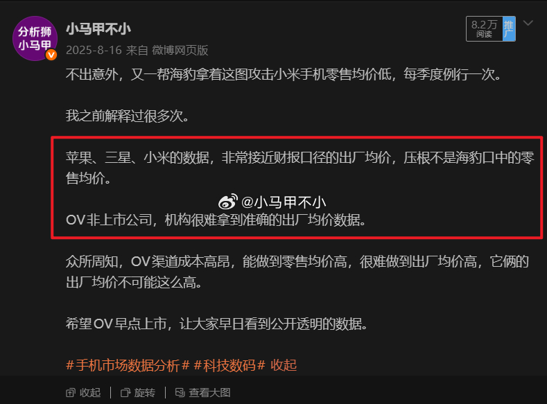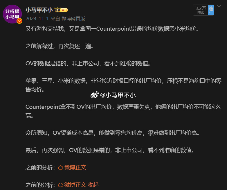 米黑请答题:为何Counterpoint报告中小米手机均价严重偏低? 图二canalys,小米海外均价约180美元,算上国内,全球均价超过200美元图三IDC,中国市场,OVM均价差不多图四IDC,小米全球均价超过200美元图五IDC,小米全球均价220美元那么问题来了,为何Counterpoint报告中小米手机均价只有150美元,严重偏低呢?为何与IDC、canalys报告有较大偏差呢?更夸张的,三星均价,counterpoint 约300美元,IDC约450美元,相差高达150美元。巨大差异源自何处?更夸张的,OPPO均价,counterpoint与IDC却很接近,为何小米三星差异大,OPPO却差异小?告诉你一个秘密:counterpoint报告发布时间,刚好在苹果三星财报公布后的一两天。counterpoint报告中的苹果、三星、小米均价数据,非常接近财报口径的出厂均价,压根不是米黑口中的零售均价。OV非上市公司,counterpoint很难拿到准确的出厂均价数据。众所周知,OV渠道成本高昂,能做到零售均价高,很难做到出厂均价高,它俩的出厂均价不可能这么高。希望OV早点上市,让大家早日看到公开透明的数据。手机市场数据分析