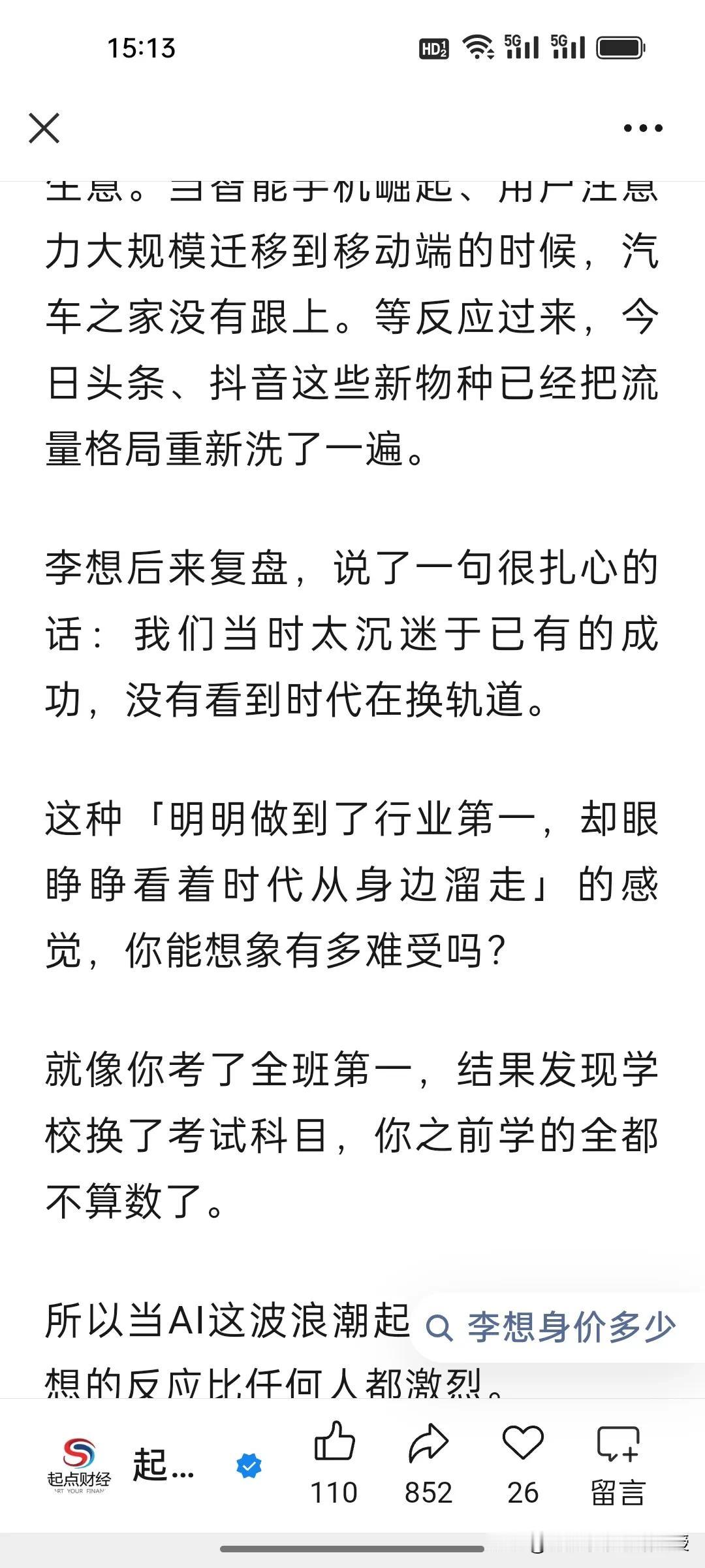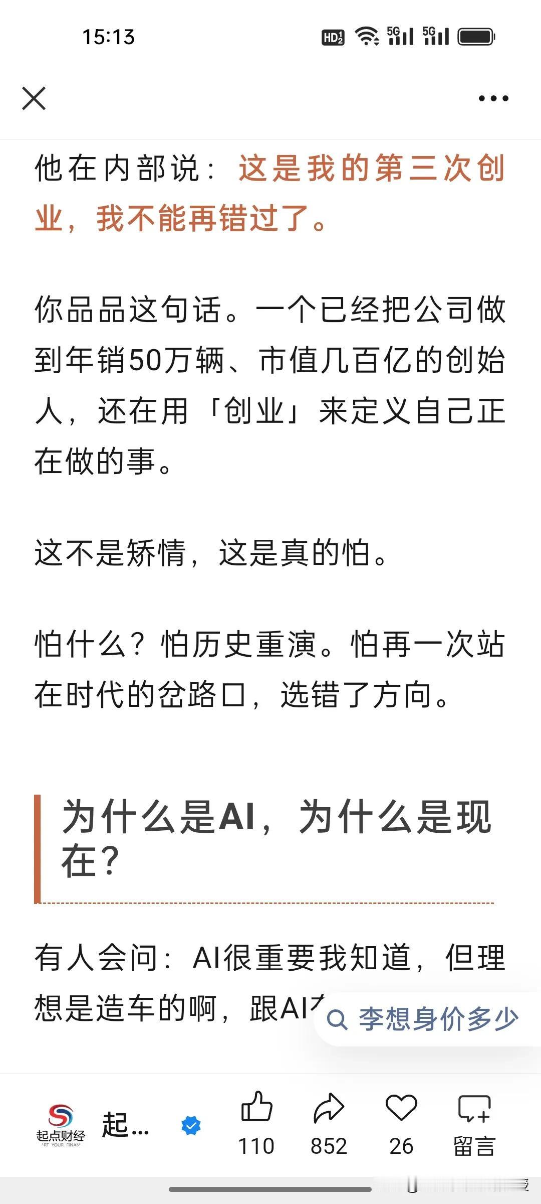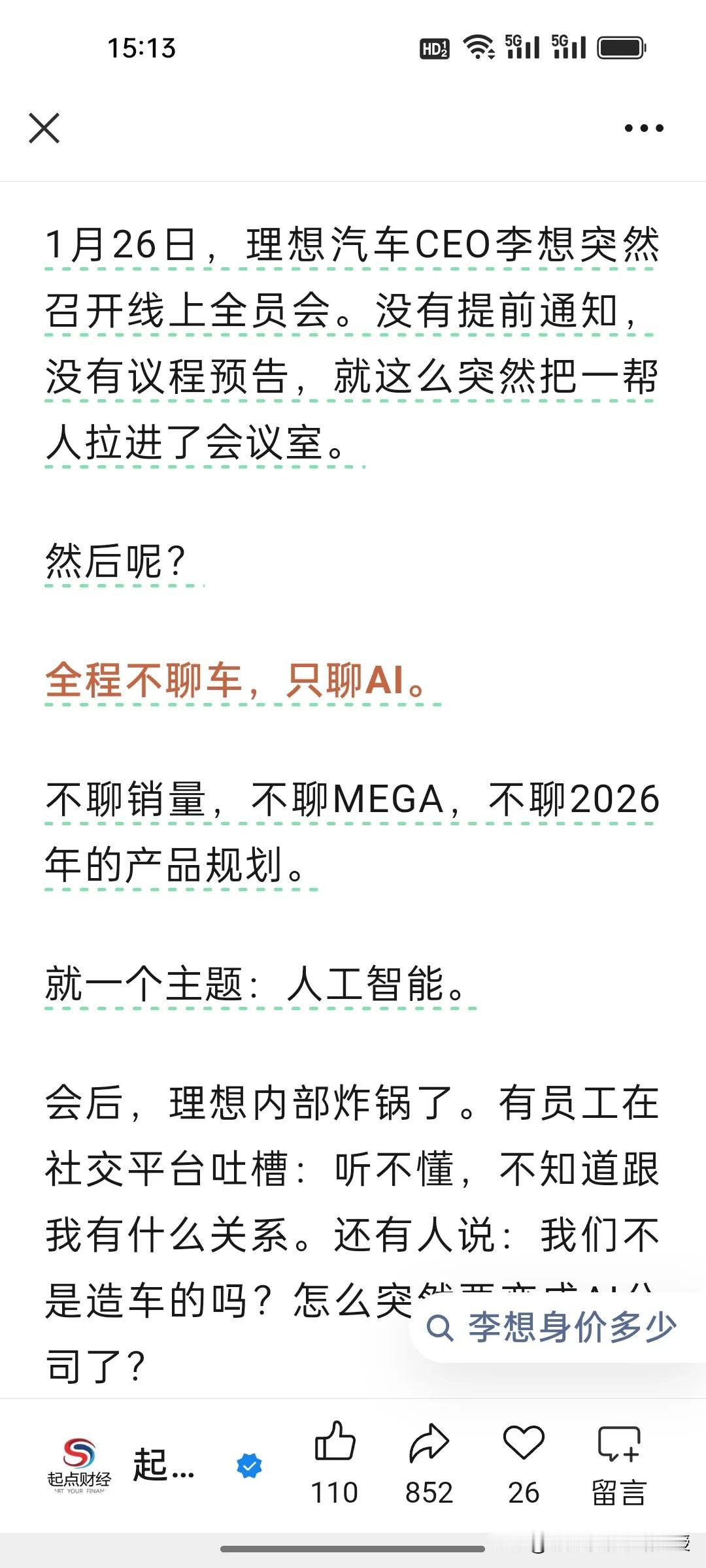 李想也是受到马化腾在年会上发力AI的启发吗?为何大佬们集体押注AI,李想竟开两小时会议不谈车只布道AI? 1月26日,理想临时全员会上,李想直言2026是AI头部最后窗口期,誓要跻身全球具身智能前三,还要落地人形机器人、2028实现L4智驾。他孤注一掷搞AI,只因理想增程优势被赶超,硬件壁垒不在,唯有AI能重构智驾竞争维度,让企业跳出车企内卷。 马化腾在腾讯年会上称,AI是目前唯一值得投入的领域,今年腾讯元宝过年要撒十亿红包。正因AI是产业升维核心,能重塑生产力、开辟第二增长曲线。大佬们的疯狂布局,本质是抢占未来商业生态的核心入场券,错过AI,就可能错过下一个时代!