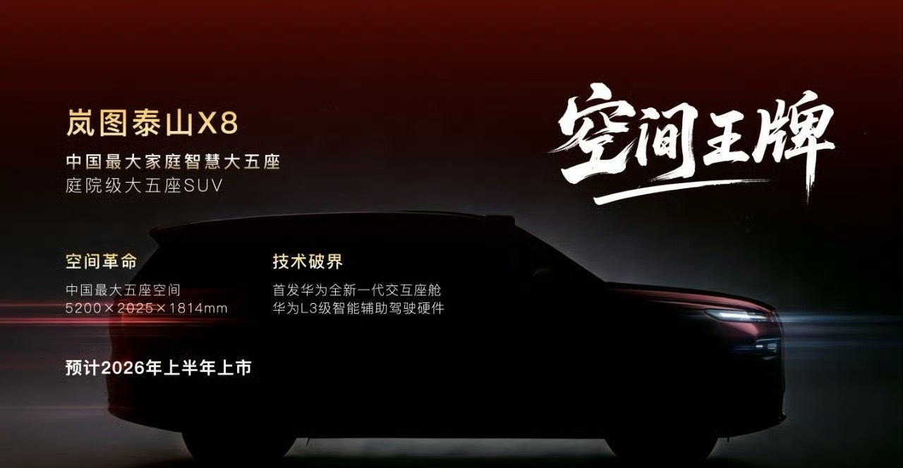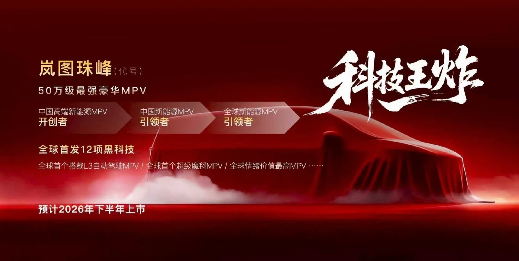 岚图泰山Ultra1月28日岚图汽车发布2026新品计划,以“三王一炸”巩固高端新能源市场优势,其中50万级豪华MPV代号“珠峰”成核心科技王炸。该车全球首发12项黑科技,拿下三项全球首个技术突破,重新定义MPV豪华体验天花板,将于下半年上市。作为高端新能源MPV引领者,岚图梦想家蝉联销量、NPS双冠,此次珠峰与梦想家形成产品组合,剑指全品类MPV销冠,抢占传统豪华MPV市场,冲刺全球新能源MPV引领者地位。岚图泰山X8岚图FE岚图珠峰