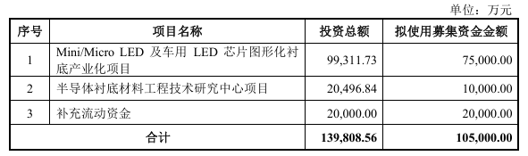 根据招股书,本次募集资金将用于“Mini/MicroLED及车用LED芯片图形化衬底产业化项目”和“半导体衬底材料工程技术研究中心项目”的建设。本次募集资金投资项目围绕公司主营产品投资扩大产能规模,同时建设大尺寸半导体衬底材料、MicroLED等关键材料技术研究平台。