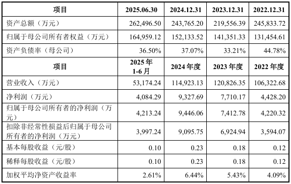 财务方面,于2022年度、2023年度、2024年度、2025年1-6月,公司实现营业收入分别约10.63亿元、12.08亿元、11.49亿元、5.32亿元;同期,分别录得净利润4428.20万元、7710.17万元、9327.69万元、4084.29万元。