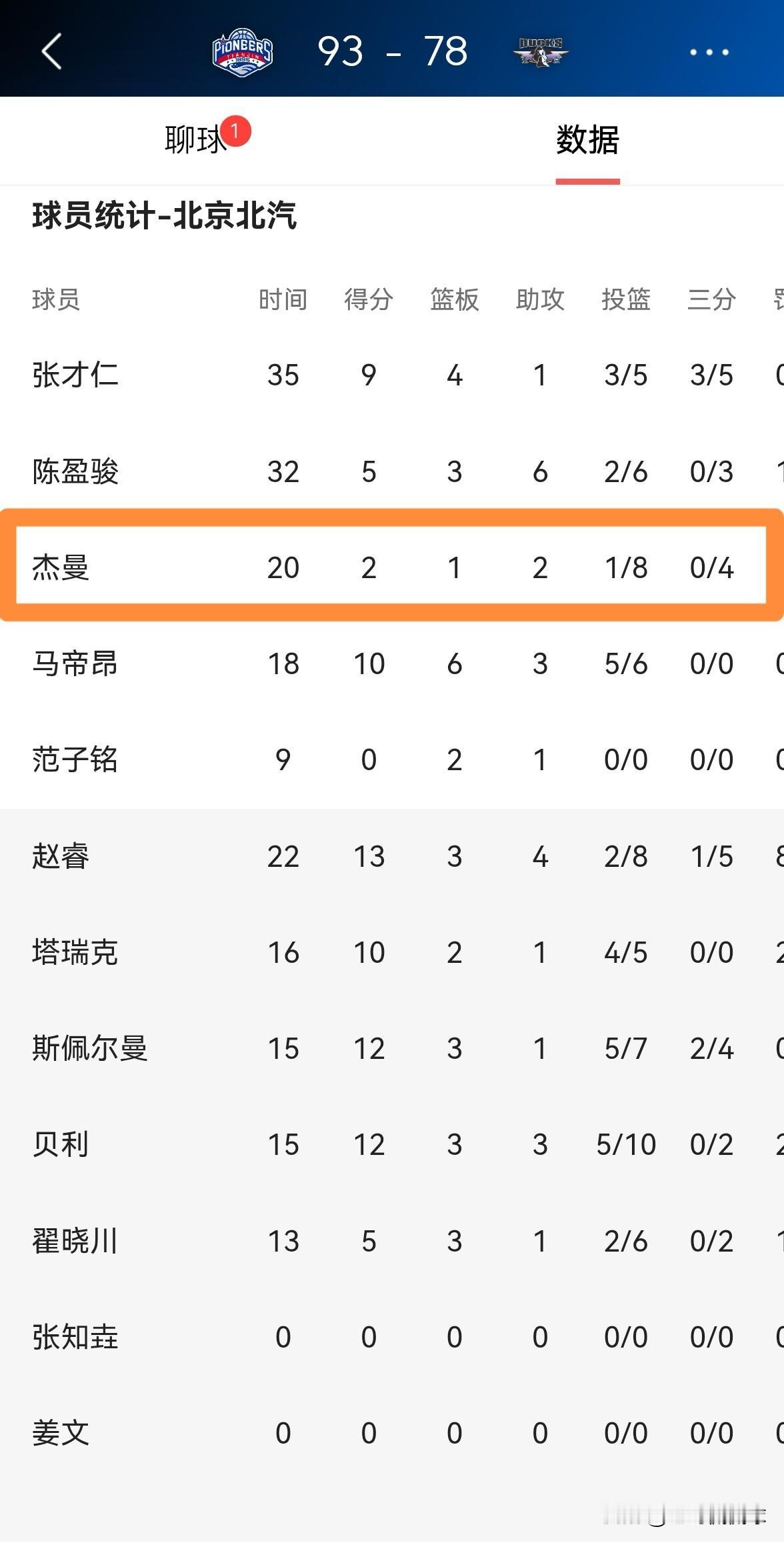 我必须要怒喷北京北汽外援杰曼!在今天北京北汽客场以78:93输给天津先行者的比赛中,杰曼的表现简直就是一场灾难,他绝对是球队输球的罪魁祸首。 全场比赛下来,杰曼首发出战20分钟,投篮8中1,其中三分球4中0极其低效的得到2分,他的场上正负值为-16。 本场比赛杰曼在场上如同梦游一般,他在攻防两端都没有给球队提供应有的帮助。