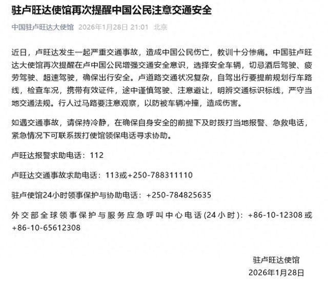 近日,卢旺达发生一起严重交通事故,造成中国公民伤亡,教训十分惨痛。中国驻卢旺达大使馆再次提醒在卢中国公民增强交通安全意识,选择安全车辆,切忌酒后驾驶、疲劳驾驶、超速驾驶,确保出行安全。卢道路交通状况复杂,自驾出行要提前规划行车路线,检查车况,携带有效证件,途中谨慎驾驶、注意避让,明辨交通标识标线,严守当地交通法规。行人过马路要注意观察,以防被车辆冲撞,造成伤害。