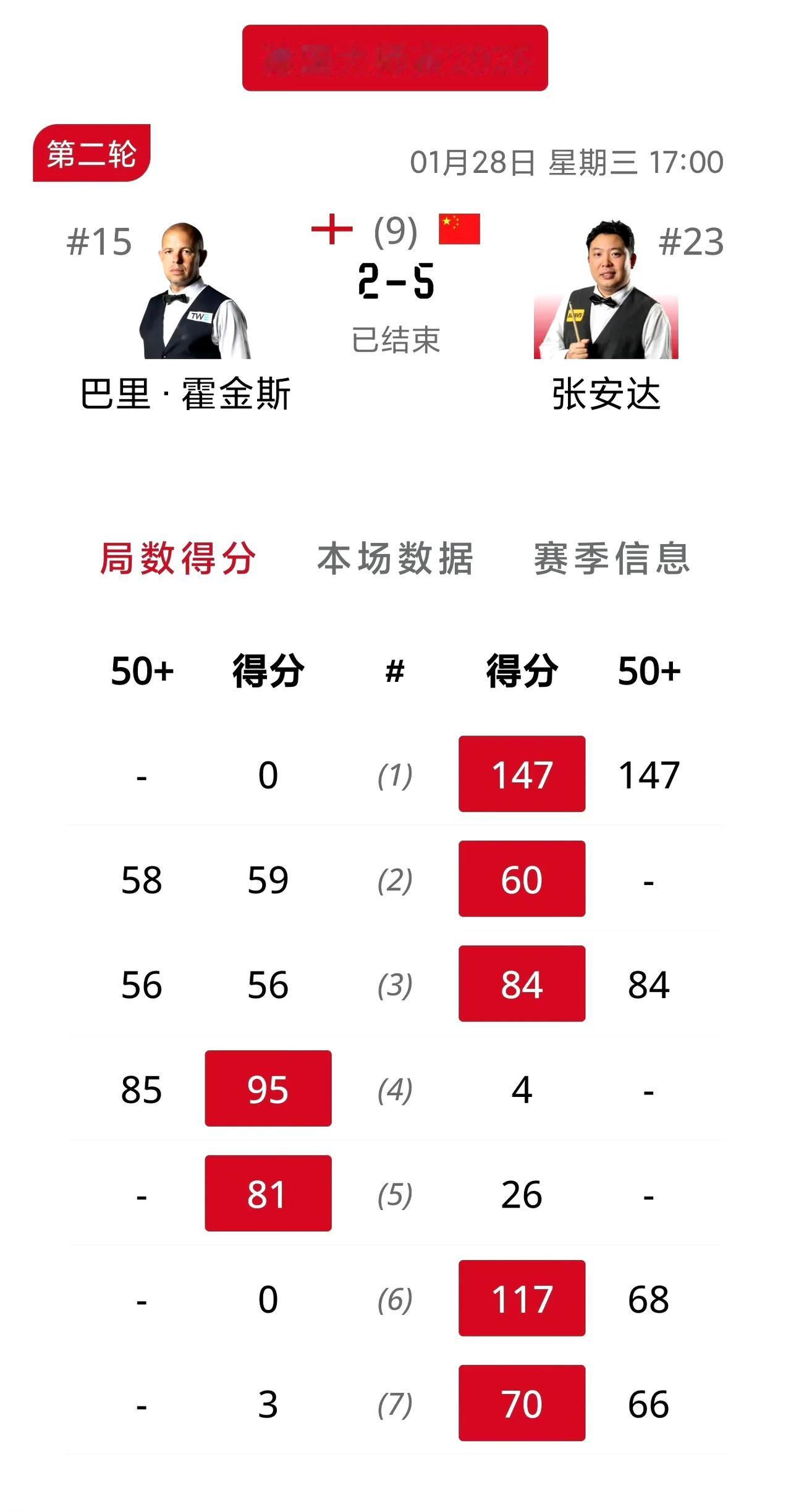 张安达狂轰满分大胜霍金斯!这比赛看的非常精彩,达仔自从掉出世界排名前十六后,突然就开窍了,状态回升非常明显,前两年前十六基本上都是一轮游二轮游,今天又来一杆147,个人职业生涯已经来到五杆147,紧追丁主任,照这状态打破记录已经没有悬念了[赞]