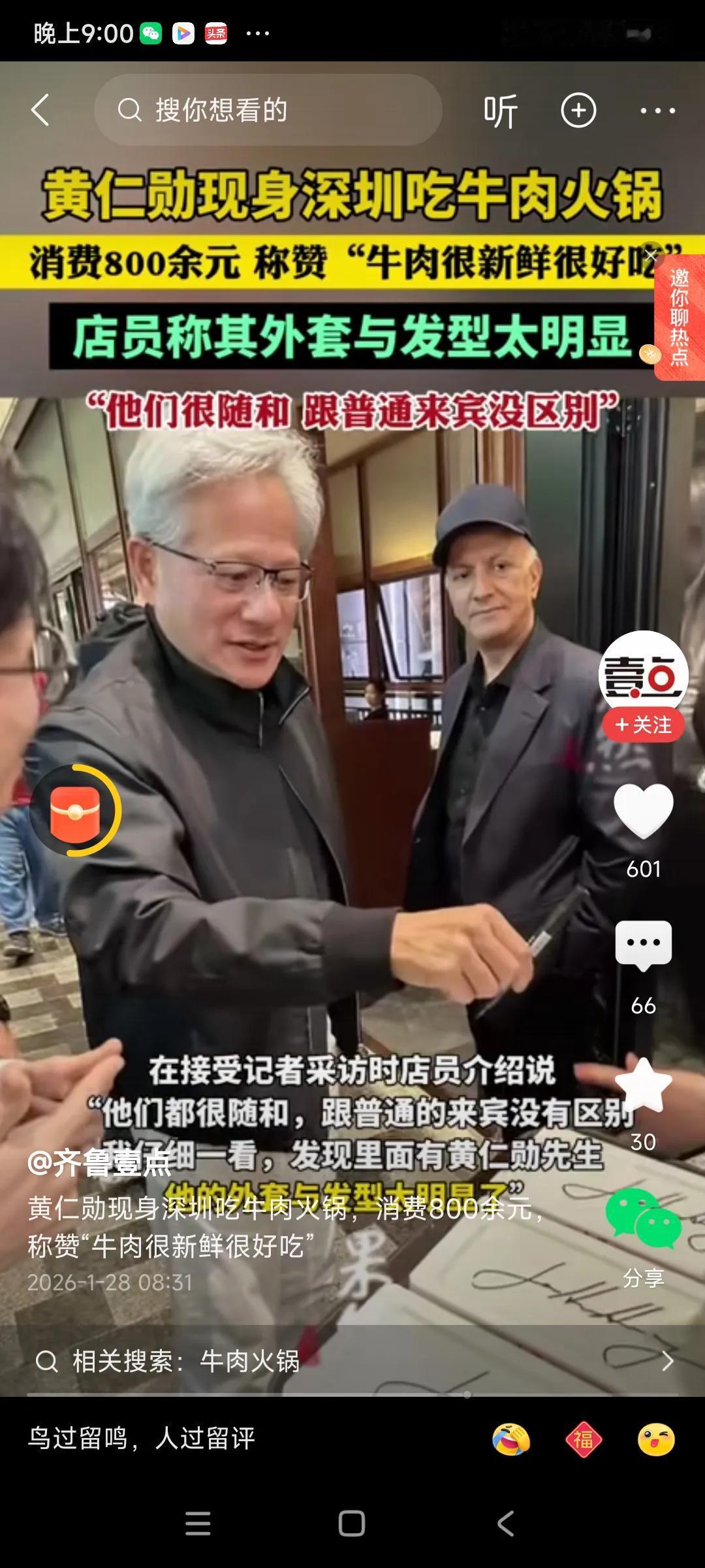 最近打开手机,为啥老是看见黄仁勋,一会在菜市场,一会儿又去了火锅店,又是给小费,又是合影留念,好像很忙啊,, 这个顶级富豪,为啥去这些地方啊,这人接地气啊,,, 他有几千亿元,钱多的花不完,,,却没什么架子,,,,特别好奇,他老是穿皮衣,穿上去是否很舒服,可能是特制的,限量版皮衣,冬暖夏凉,,[捂脸][捂脸][捂脸] 另外,他头发白完了,也没染发,好多朋友白发太多,太显衰老,都去染发了,我同事经常染发,想显得年轻一些,黄仁勋觉得无所谓,没必要折腾,不太乎外在形象,不把时间和精力耗在这上面,,,[捂脸][捂脸]
