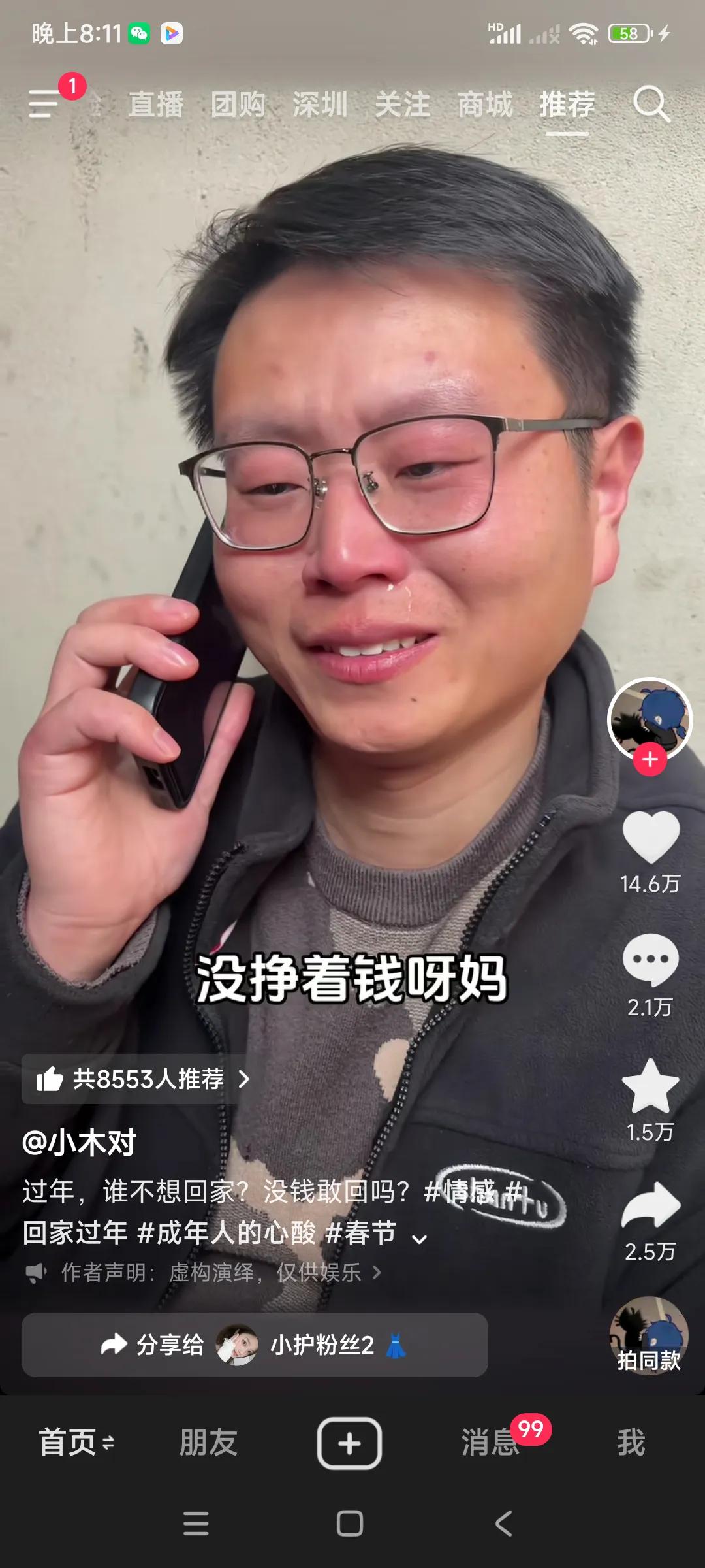 有钱没钱,回家过年,这才是正确的事,, 有些人可能顾虑太多,, 一,怕老家人催婚,不愿相亲,, 二,怕互相比较,挣钱多少, 三,怕混的不好,无颜见江东父老,, 这方面,真的向老外学习,外国人见面聊天,有三不,保护个人隐私,互相包容,, 一,不问对方收入, 二,不问对方婚姻, 三,不问对方年龄, 我前二年回老家,老家人先问你工资多少钱一个月,是否深圳买房买车,[捂脸][捂脸]