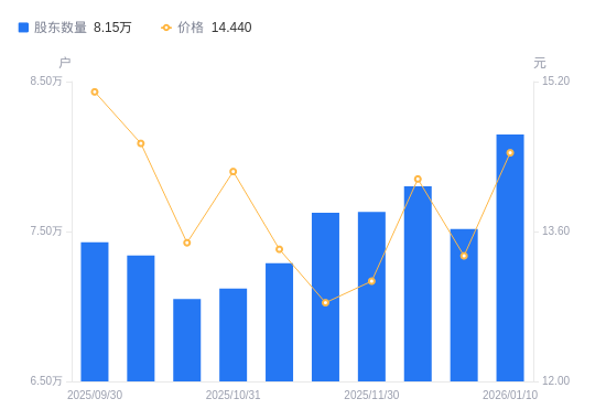 日期A股户数(户)流通A股户均持股数(股)户均持股市值(万元)2026-01-20853129109.4112.852026-01-10814779538.1813.772025-12-207516410339.2813.792025-12-10780219960.6814.102025-11-307630810184.2813.312025-11-207625610191.2213.092025-11-107289110661.7014.302025-10-317119210916.1415.542025-10-207049511024.0714.862025-10-107339310588.7815.40