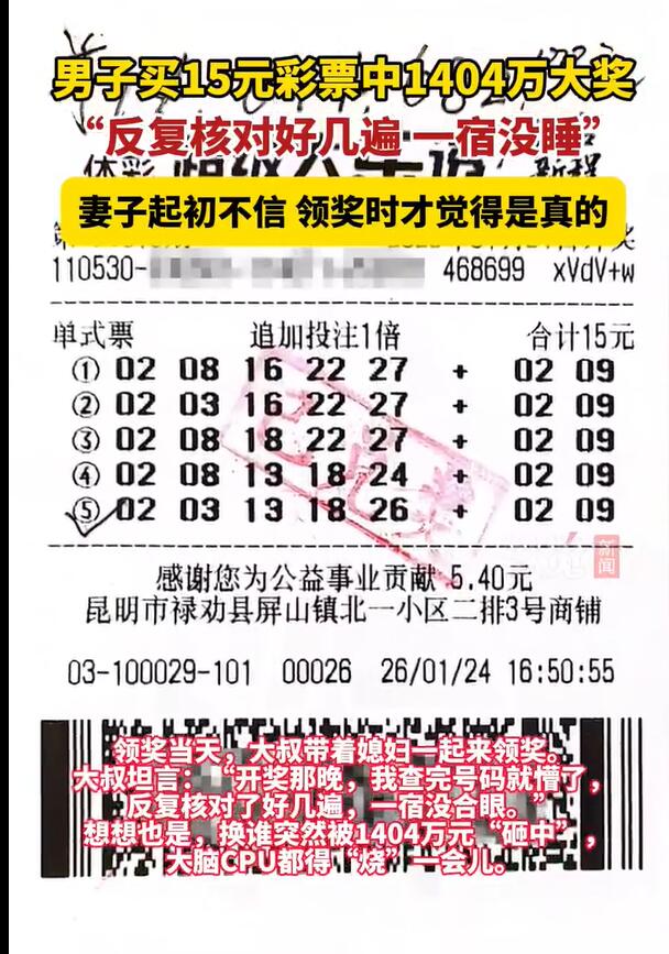 领奖当天,大叔带着媳妇一起来领奖。大叔坦言:“开奖那晚,我查完号码就懵了,反复核对了好几遍,一宿没合眼。”想想也是,换谁突然被1404万元“砸中”,大脑CPU都得“烧”一会儿。而一旁的妻子则贡献了全场最淡定的表情包。“他跟我说中奖的时候,我根本不信!”妻子笑着回忆,“我心想,这人是不是睡迷糊了?直到今天来这儿(体彩中心)了,我才觉得,哦,好像是真的。”