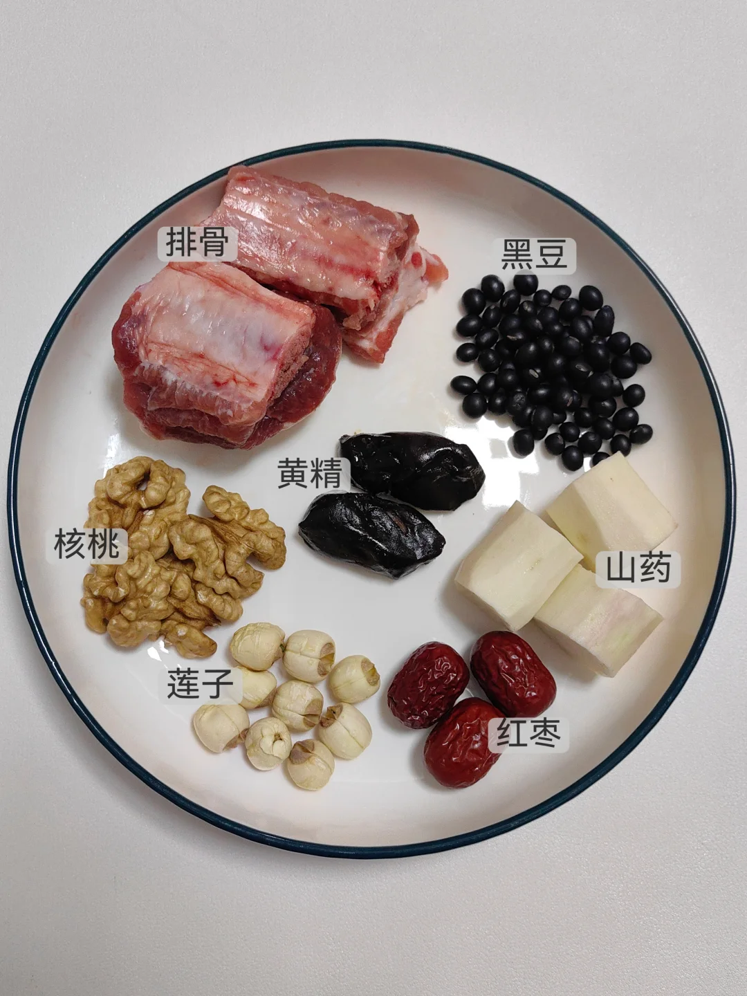 排骨、黑豆、黄精、山药、核桃、莲子、红枣