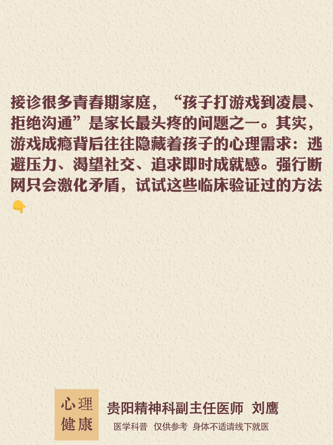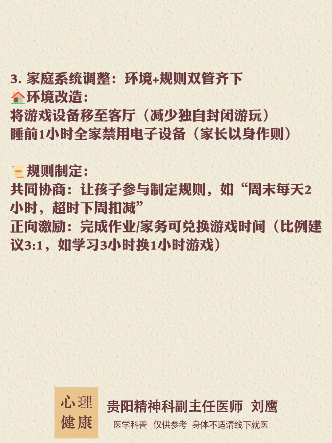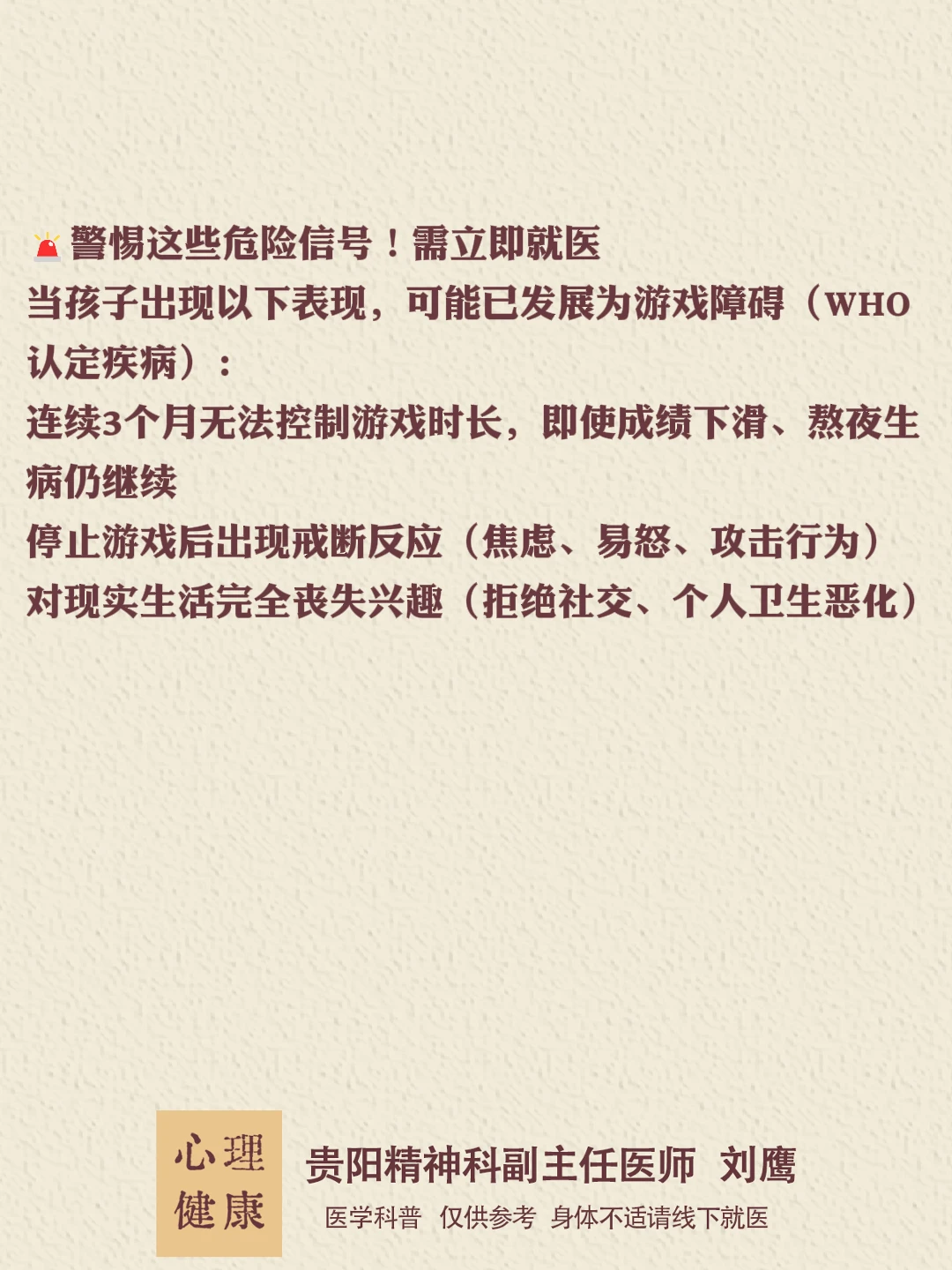🚨警惕这些危险信号!需立即就医 当孩子出现以下表现,可能已发展为游戏障碍(WHO认定疾病): 连续3个月无法控制游戏时长,即使成绩下滑、熬夜生病仍继续 停止游戏后出现戒断反应(焦虑、易怒、攻击行为) 对现实生活完全丧失兴趣(拒绝社交、个人卫生恶化)
