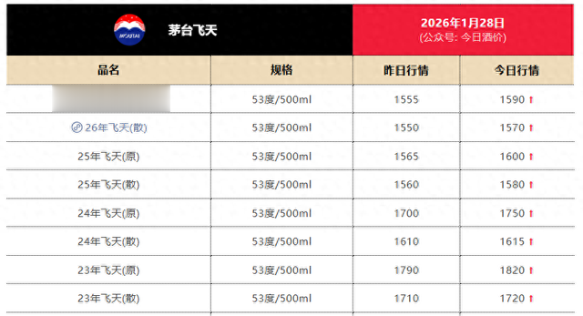 1月28日,据第三方平台“今日酒价”披露的各大名酒批发参考价显示,飞天茅台、生肖马茅台(下称“马茅”)价格全线上涨。其中,26年飞天茅台原箱(53度/500ml)报1590元/瓶,较上一日上涨35元;26年飞天茅台散瓶报1570元/瓶,较上一日上涨20元;25年飞天茅台原箱报1600元/瓶,较上一日上涨35元;25年飞天茅台散瓶报1580元/瓶,较上一日上涨20元。此外,23年飞天和24年飞天的原箱和散瓶批价也均不同程度上涨。