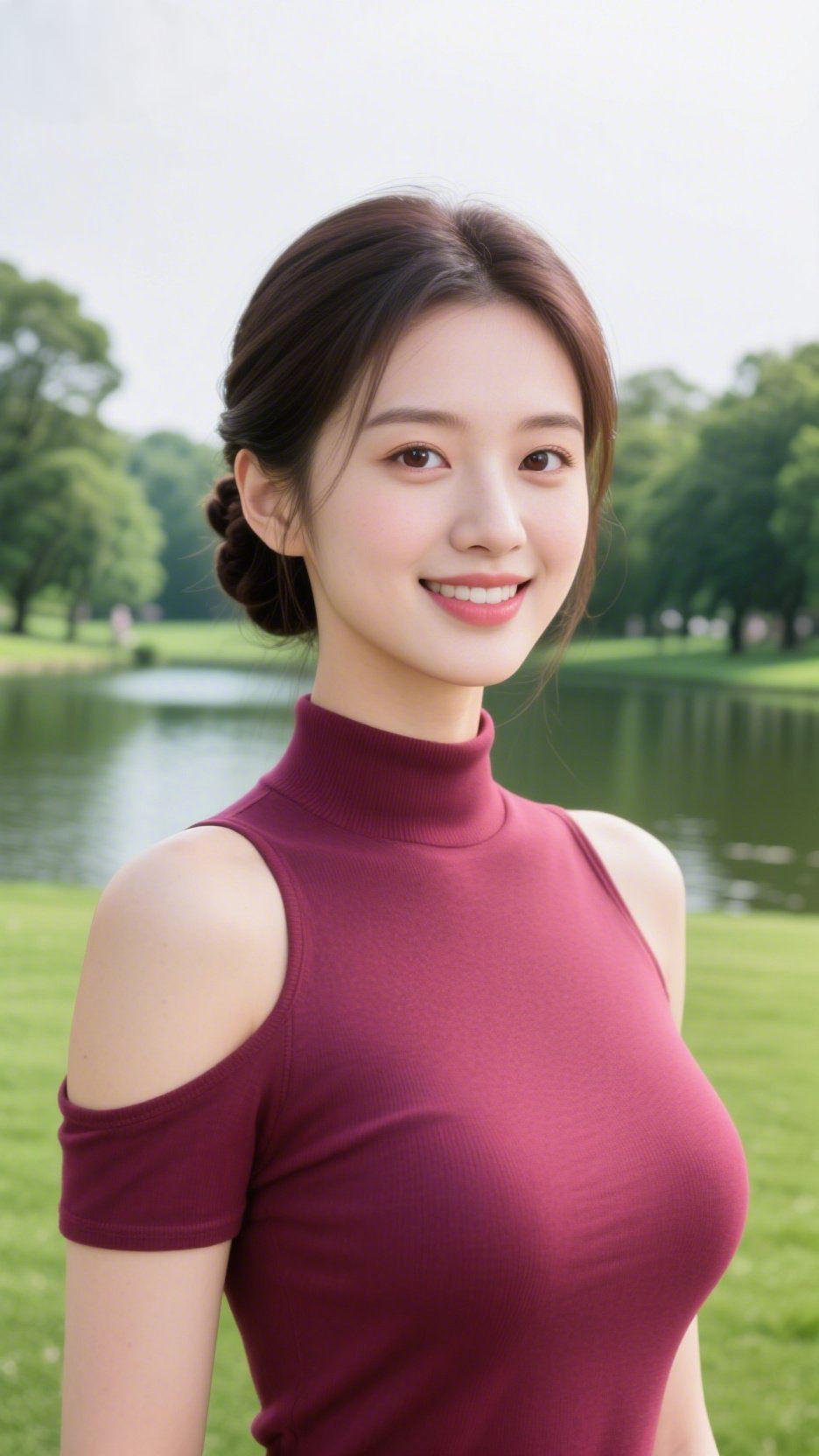 《湖畔的酒红清柔》 风裹着草木的气息漫过湖面时,她像一捧沾了晨露的酒红,落在春末的绿意里。 露肩针织衫衬着舒展的神态,高领的弧度晕着温和的柔,发梢松松挽起的结,沾着湖岸的碎光。笑起来时,眼底落满了水波的软——像午后盛在瓷杯里的淡茶,暖得妥帖,又带着草木的清。 对岸的树影浸在水里,风掠过草尖的声响很轻,她站在那里,把春的软意揉成日常的温。原来舒展从不是刻意的模样,是恰好的松弛,是湖畔的风里,忽然撞进眼里的、裹着生活温度的柔缓。 湖畔春景随拍 日常雅致穿搭