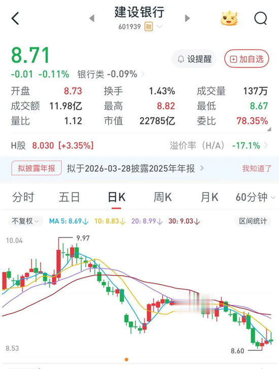截至1月28日收盘,建设银行报8.71元/股,总市值为22785亿元。