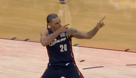 詹姆斯被判卡位时进攻犯规,随后泰森模仿裁判做出庆祝动作