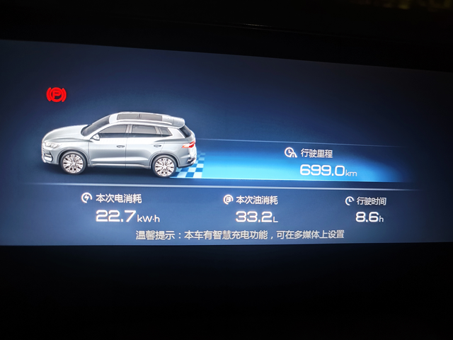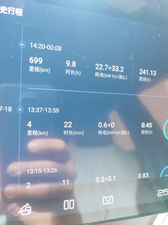 南安~宝安来回1430公里,出发时满油满电,回来时补油130元17升左右,电且不计这油箱满油52升+17=69升,现在油表不显示已是低于20公里里程了,如图行程记录居然少了10升油了
