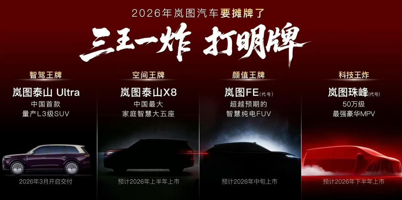 几个央企新能源品牌当中,岚图真的是“老谋深算”!1月28日,岚图放出2026年“三王一炸”产品规划:岚图泰山 Ultra指向中国首款量产 L3 级 SUV(3月开启交付);岚图泰山X8指向大五座(上半年上市);代号岚图FE的纯电FUV指向颜值(年中上市);代号岚图珠峰的MPV车型剑指50万级豪华市场(下半年上市)。有没注意到?岚图这波产品宣传的措辞非常不客气,喊出“首款”、“最大”、“超越预期”、“最强”,都不像传统央企的作风......值得注意的是,就在产品规划发布的同一天,中国证监会国际合作司发布备案通知书,岚图汽车科技股份有限公司以介绍方式在香港联合交易所上市的事项已获备案,标志境内境外发行上市监管流程打通——介绍上市虽不募资,但挂牌后股价依赖基本面支撑;“三王一炸”以 L3 智驾、超大空间、豪华配置强化高端标签,为资本市场提供 “智驾领先 + 高端盈利” 的估值锚点,契合港股对新能源高端化与智能化的偏好!背靠东风,绑定华为,力扛“大自主”,岚图现在的战略节奏感越来越强了。【来自懂车帝车友圈】