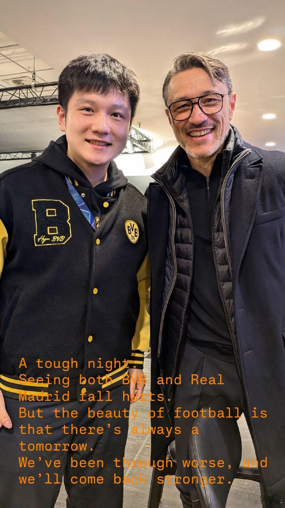 樊振东回应现场观战多特樊振东与多特主帅合影在社媒晒出与波尔现场观战多特蒙德比赛,并与主帅科瓦奇的合影照片,并写道:艰难的夜晚,同时看到多特和皇马落后的感觉有点痛,但足球的魅力就是永远都有明天,我们经历过更困难的时刻,但我们会强势归来。樊振东波尔现场观战多特