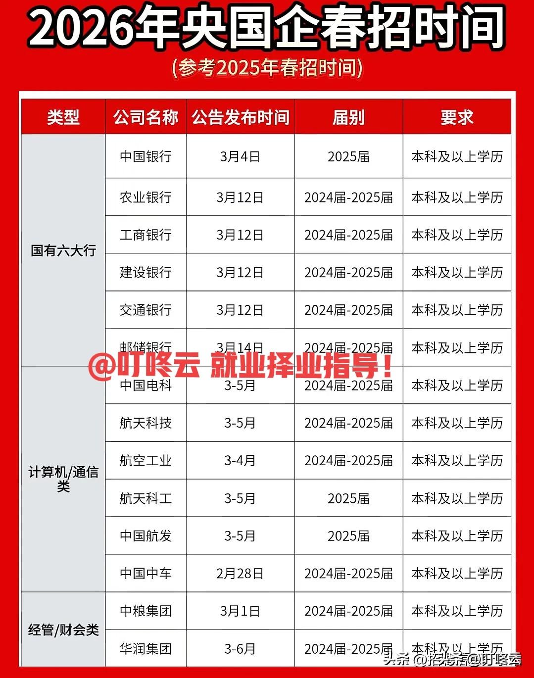 国央企招聘大集合!50家顶级央国企26年招聘要求汇总合集!收藏这篇就够用!@叮咚云 帮你解读重点和职业指导。[点亮平安灯][点亮平安灯] 最近有什么国企招聘吗 [福]一、中国烟草招聘专题:1~2月招聘公司包括郑州烟草研究院、中烟机械、常德烟草机械、秦皇岛烟草机械等;各省市烟草公司将会3月份集中爆发,速速围观揭秘详细内容! [福]二、国有六大行银行系统、计算机、通信工程、经管或财会类15个央国企招聘汇总! [福]三、国家电网、烟草、三桶油、四大运营商等等15大央国企招聘汇总! 希望各位家长和同学能够事半功倍,早日找到合适工作!速速围观揭秘详细内容!欢迎关注@叮咚云 将优先为粉丝职业规划指导,为你定制最适合的就业择业方案!欢迎留言交流讨论。[来看我][来看我] 免责声明:图片来自网络,仅供参考!