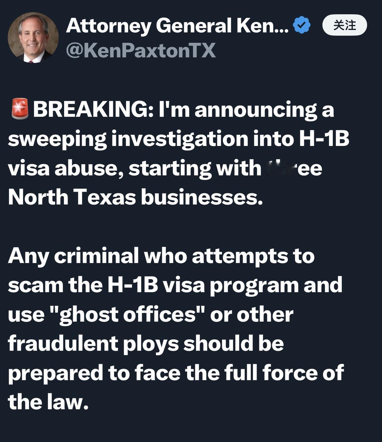 美国得克萨斯州总检察长肯.帕克斯顿: “我宣布将对 H-1B 签证滥用行为展开全面调查,首先从北德克萨斯州的三家企业开始。 任何企图诈骗 H-1B 签证计划并使用“幽灵办公室”或其他欺诈手段的犯罪分子,都应该做好面对法律严惩的准备。”